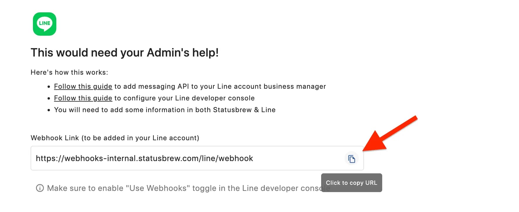 Next, copy the Webhook URL that Statusbrew automatically generates for your LINE connection. The URL is prepared for you — simply click Click to copy URL in Statusbrew.