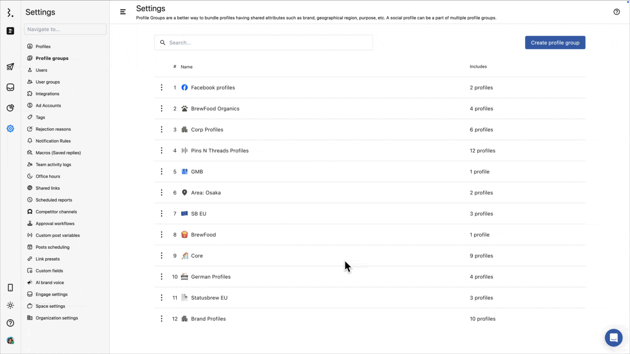 Setting permissions for profile groups helps you manage access for multiple profiles at once. Use this when you want to apply the same permissions to a set of profiles, for example, all profiles for a brand, region, or client, so you don’t need to assign the same permissions to each profile individually.