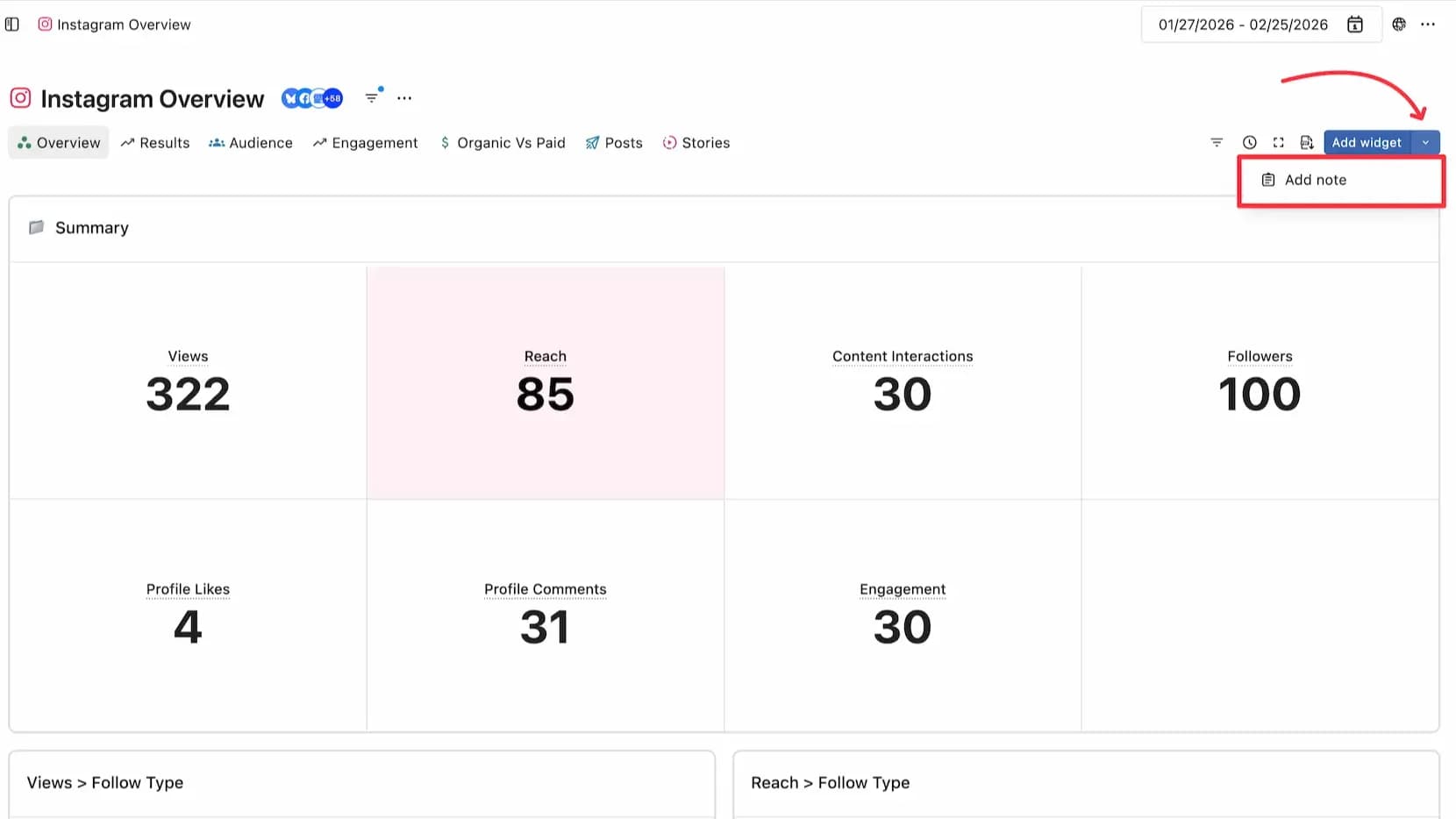 Click the arrow to the right of Add Widget at the top of the screen and select Add Note . A note will be added to the bottom of the report.