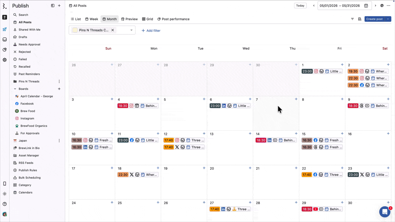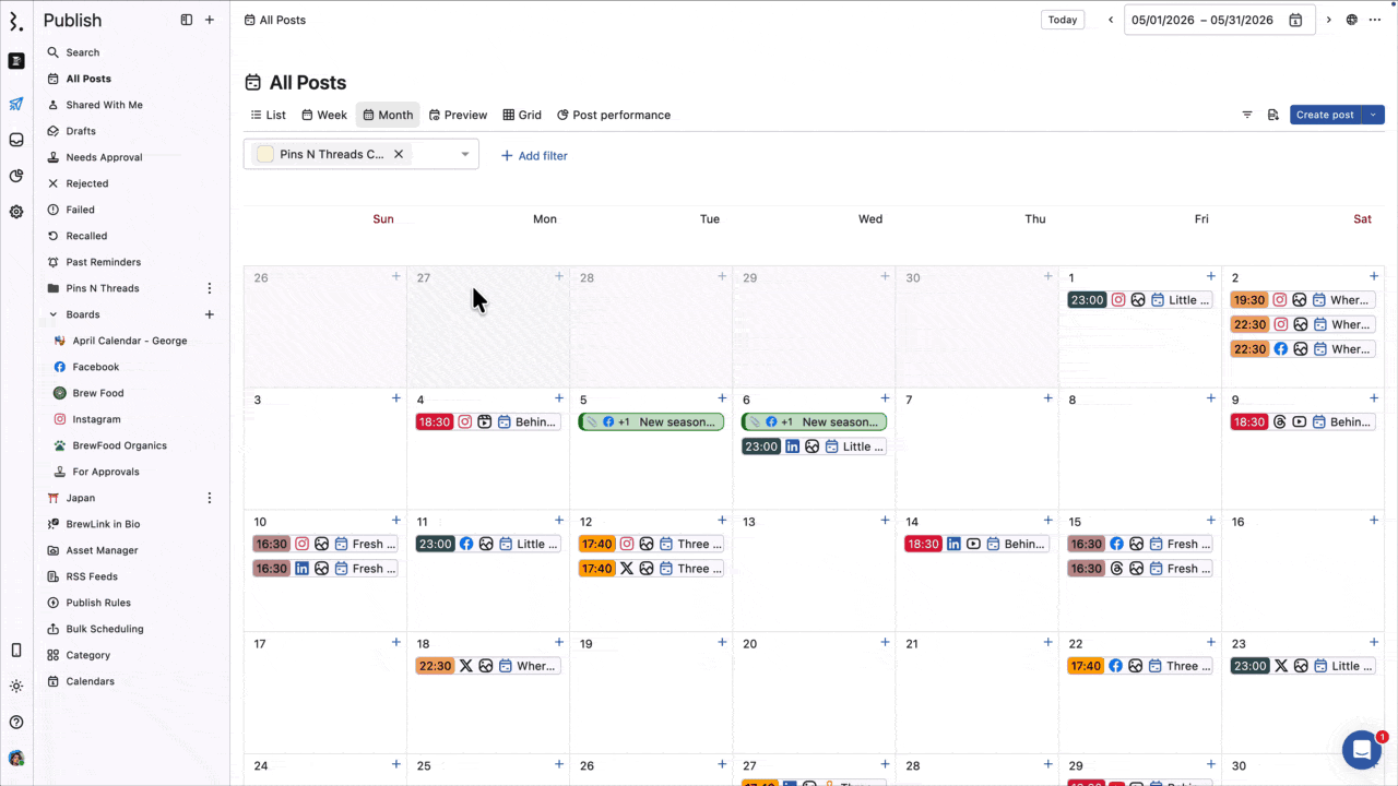 From the List, Week, Month, Preview, or Grid View, find the post you want to apply tags to and click on it to open the Post Detail view.
