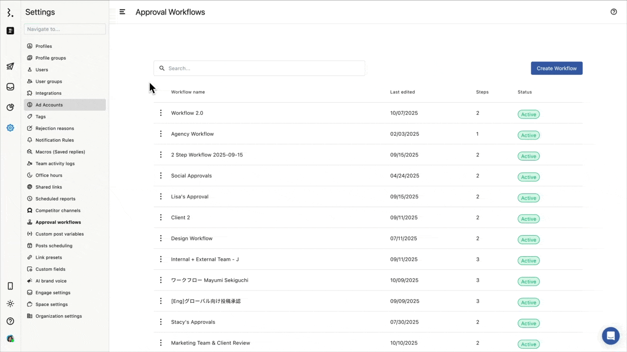 Go to Settings > Approval Workflows. The Approval Workflow window will open, showing a list of all workflows you (or your team) have created. Here, you can see each workflowâs name, last edited time, number of steps, and its current status (active or paused). From here, you can select any workflow to manage or update, or use the search bar to quickly find a specific workflow.