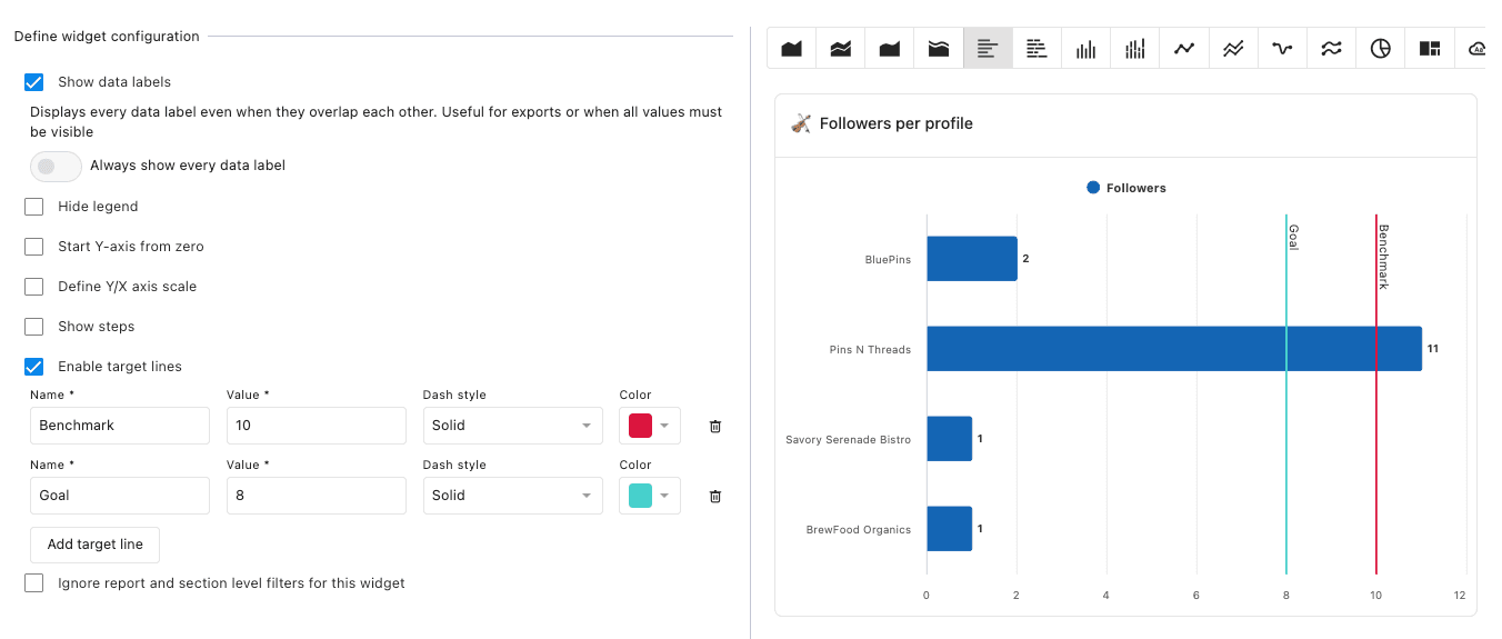 Statusbrew reports allow you to set Target lines in the widget settings. Let's take a look.