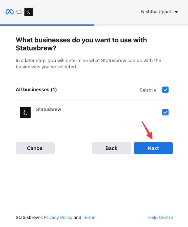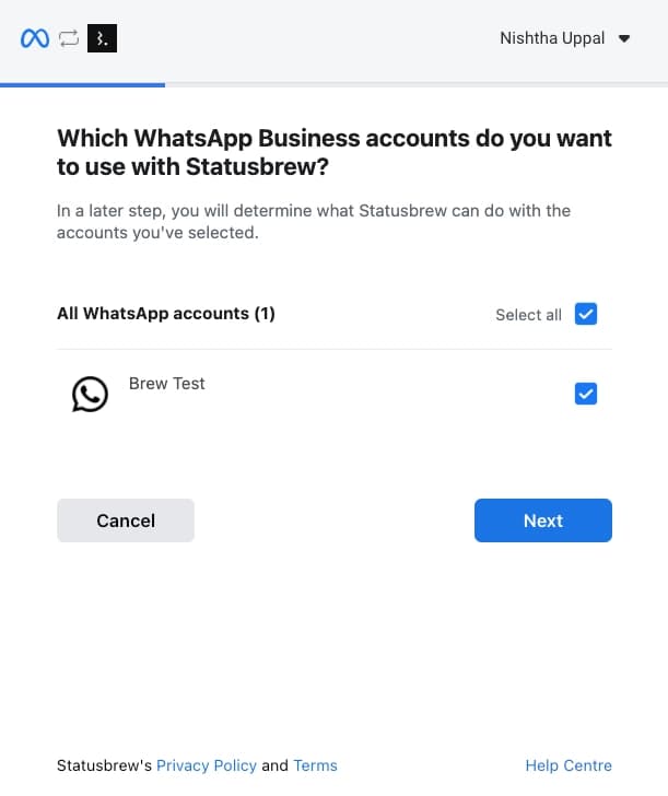 Select the WhatsApp Business Accounts you want to connect with Statusbrew and click Next.