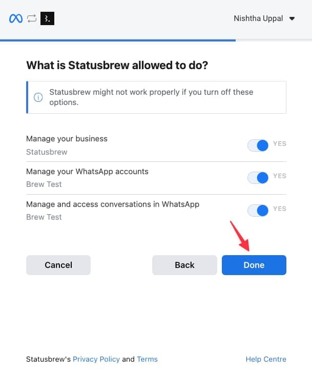 Enable all requested permissions for Statusbrew. (All permissions are required to ensure that Statusbrew can manage messages, contacts, and reporting properly.) Click Done.