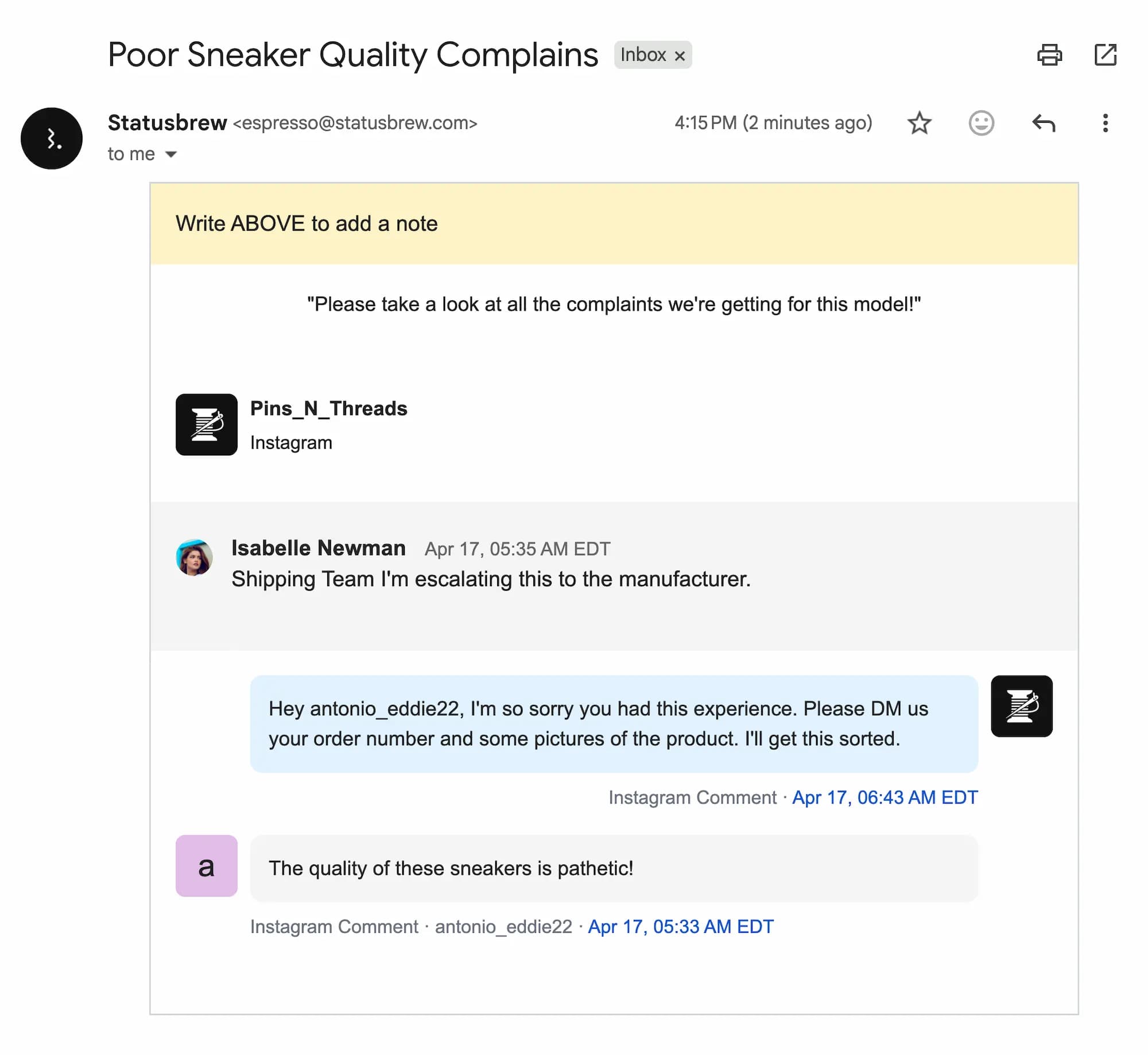 The recipient will receive an email with the conversation. If they are a user of your Statusbrew space, they can click View conversation to be directed to the conversation in Statusbrew or reply directly via email.