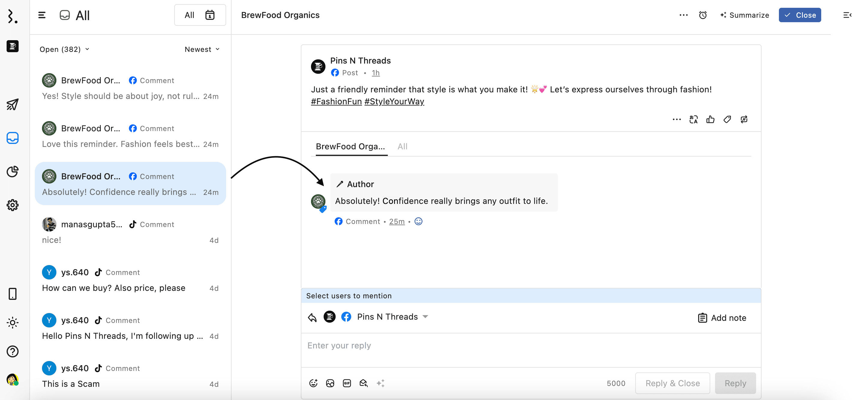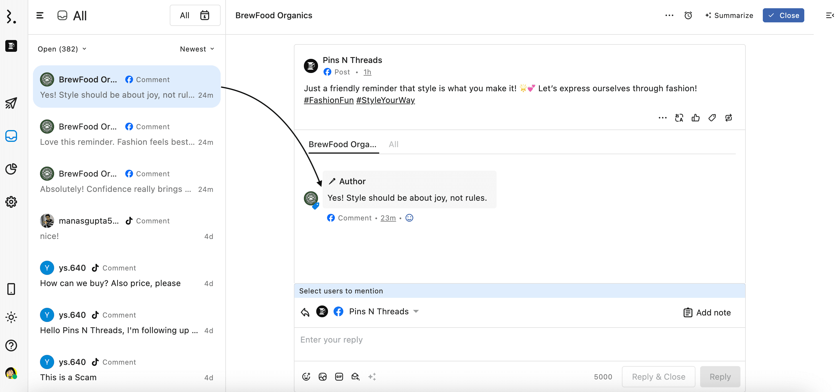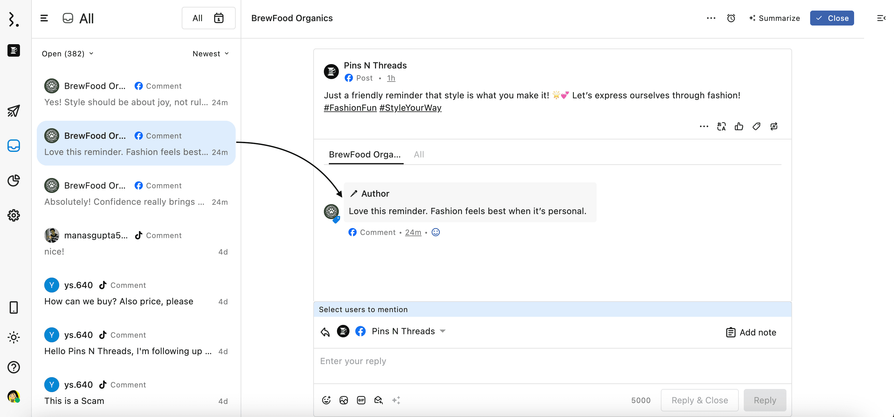Statusbrew gives you control over how comments on a post by the same person are grouped in your Engage inbox.