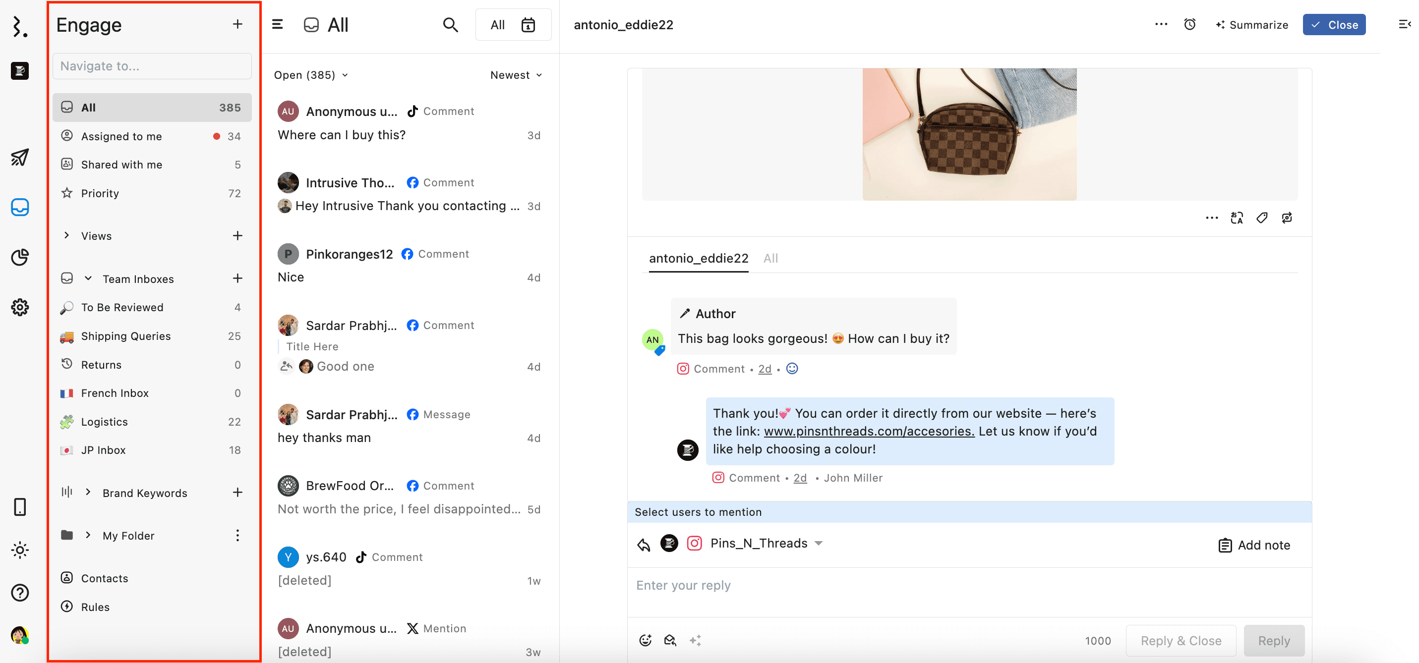 To keep your Engage sidebar organized and easy to navigate, you can organize your views, team inboxes, and brand keywords inbox into folders. There are two types of folders: