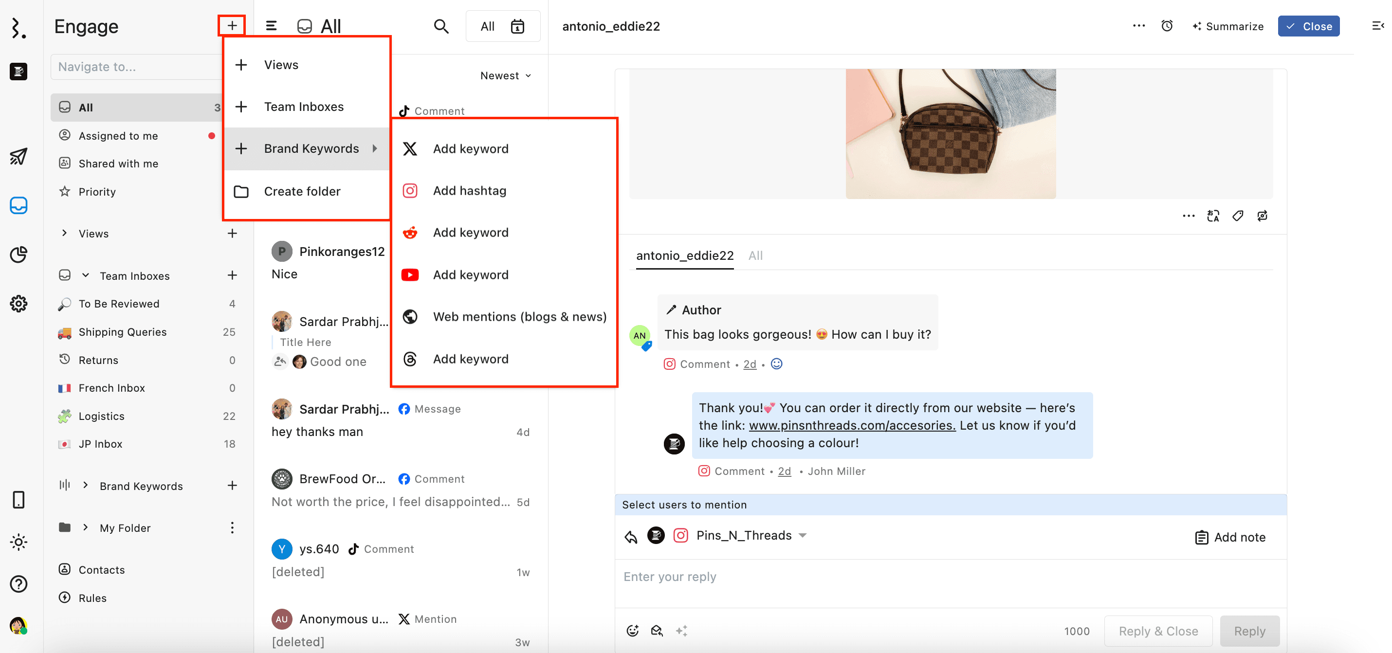 Create views, team inboxes, and brand keywords inboxes directly within a folder.
