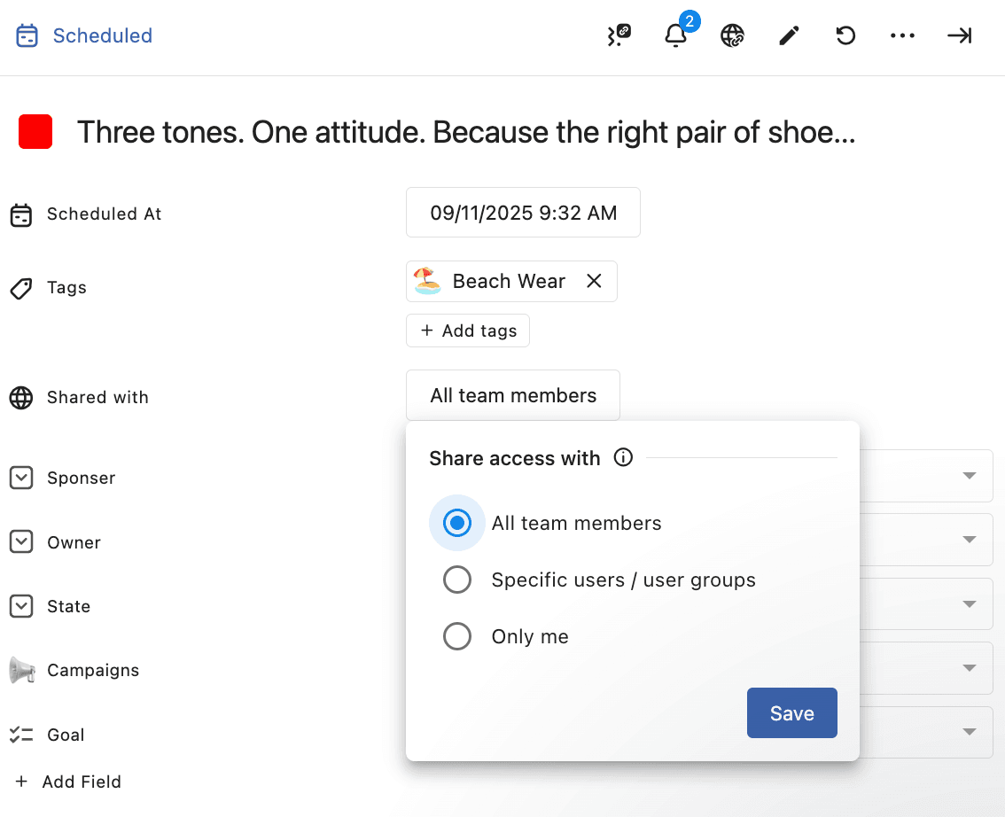 Shared with: You will be able to view the current Shared with settings of the post in Shared with. Click on it to change the Share access with settings of the post. This option is editable only by the user who created the post.