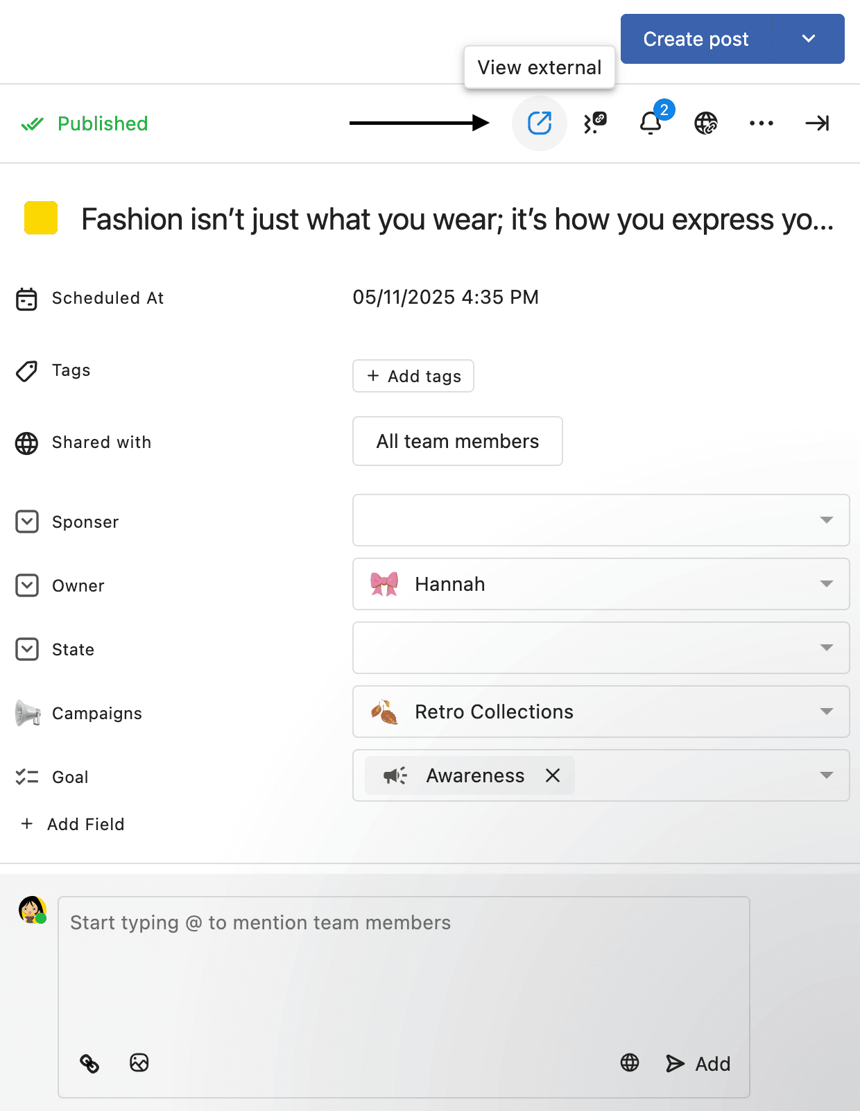 To make this easier, Statusbrew provides a direct permalink to the published post via the (View external), so you can quickly jump to the native platform and make the necessary updates from the Post Detail.