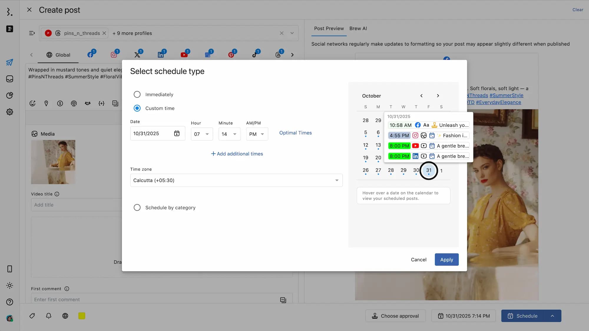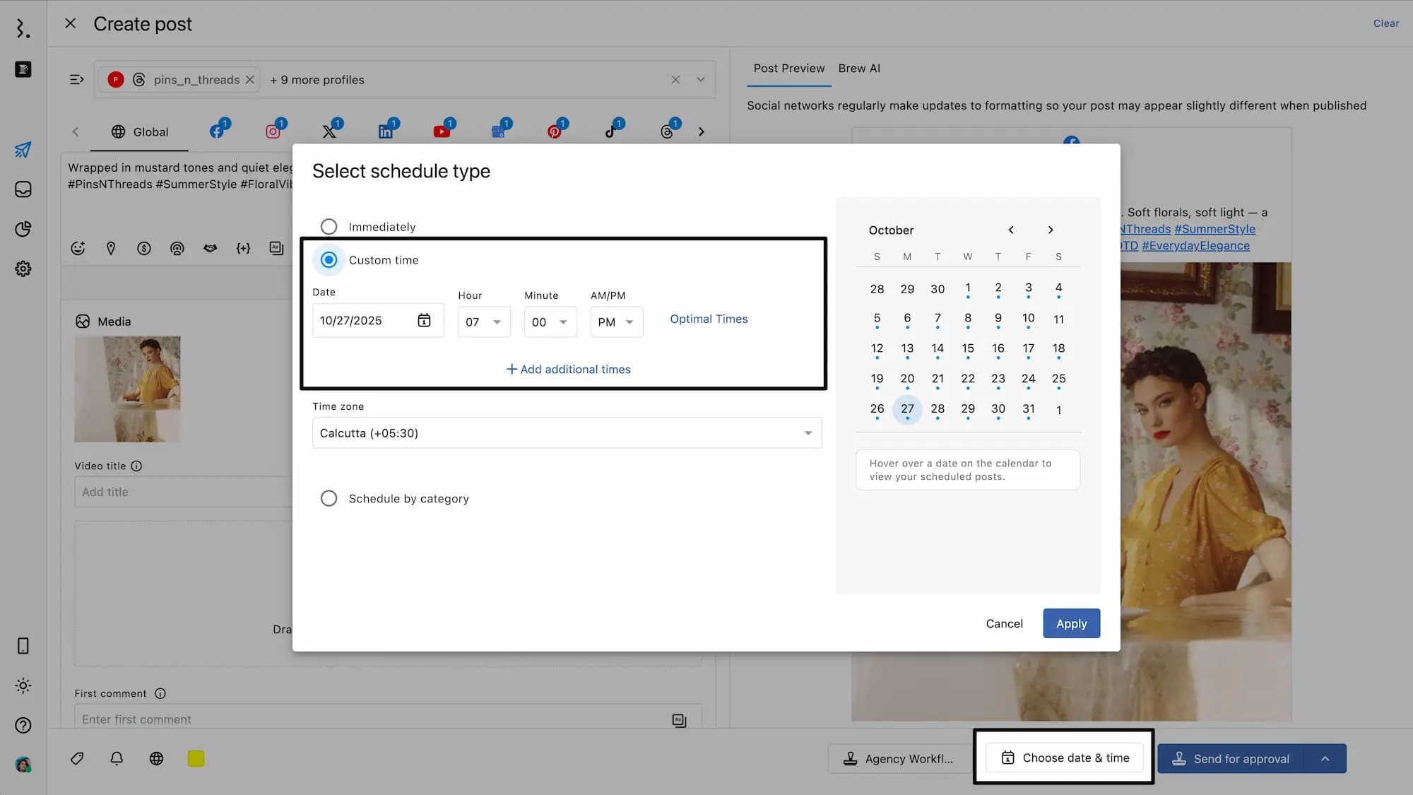Select Custom time to manually choose a date and time to schedule your content. By default, the current date and time set is one hour apart from the current time. You can change and select a date and time to schedule (schedule time should be at least 15 minutes ahead of the current time). Statusbrew allows you to schedule posts down to the minute.