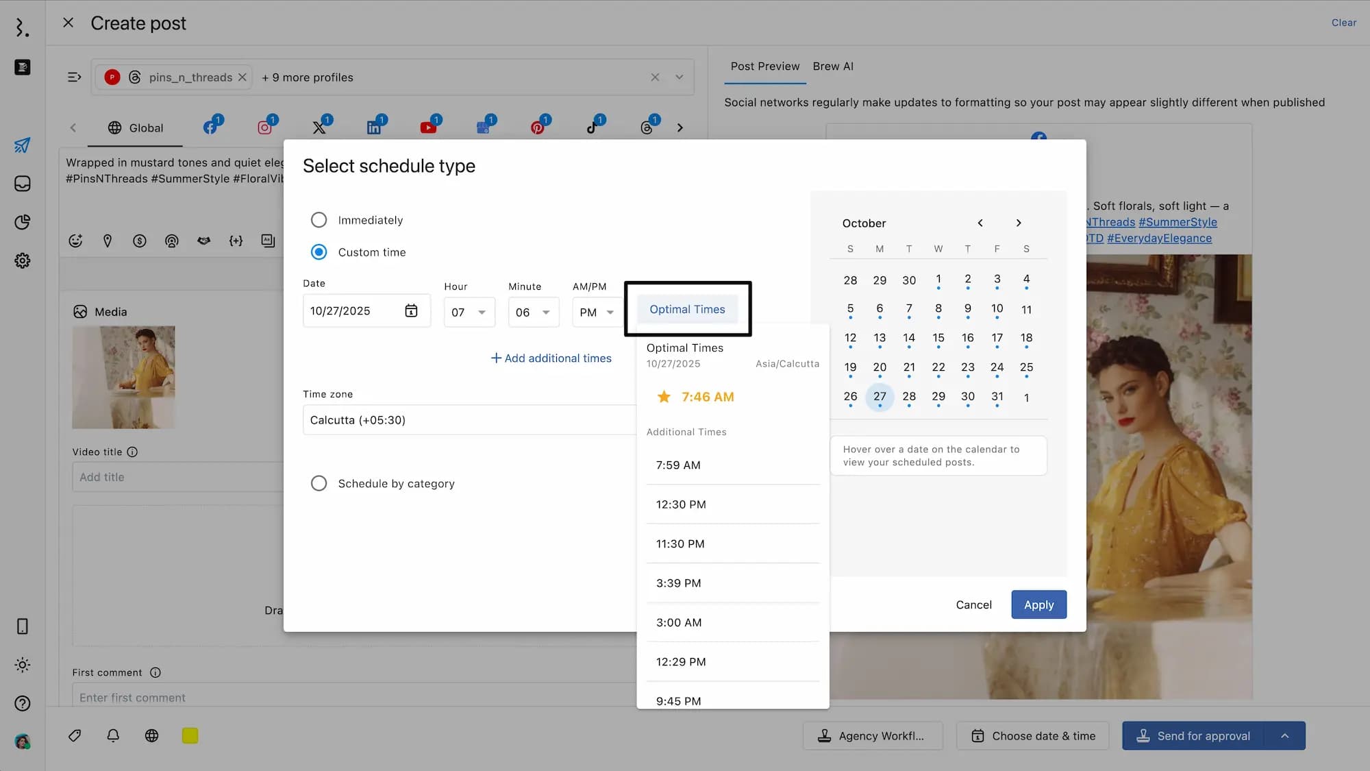 If you want to schedule your post for the best time of the day, click Optimal Times after selecting the date. You will see the suggested best time to post, which is highlighted in yellow with a star beside it. Click on that time to set it. You can also select from the Additional Times in the dropdown.
