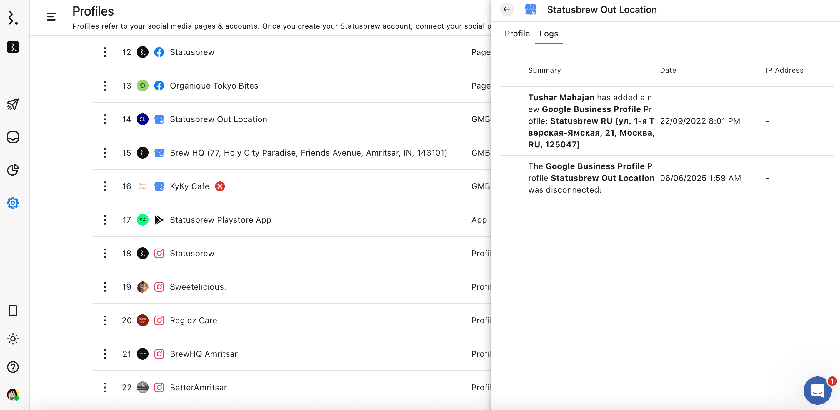 List Of Social Profiles Connected to Statusbrew