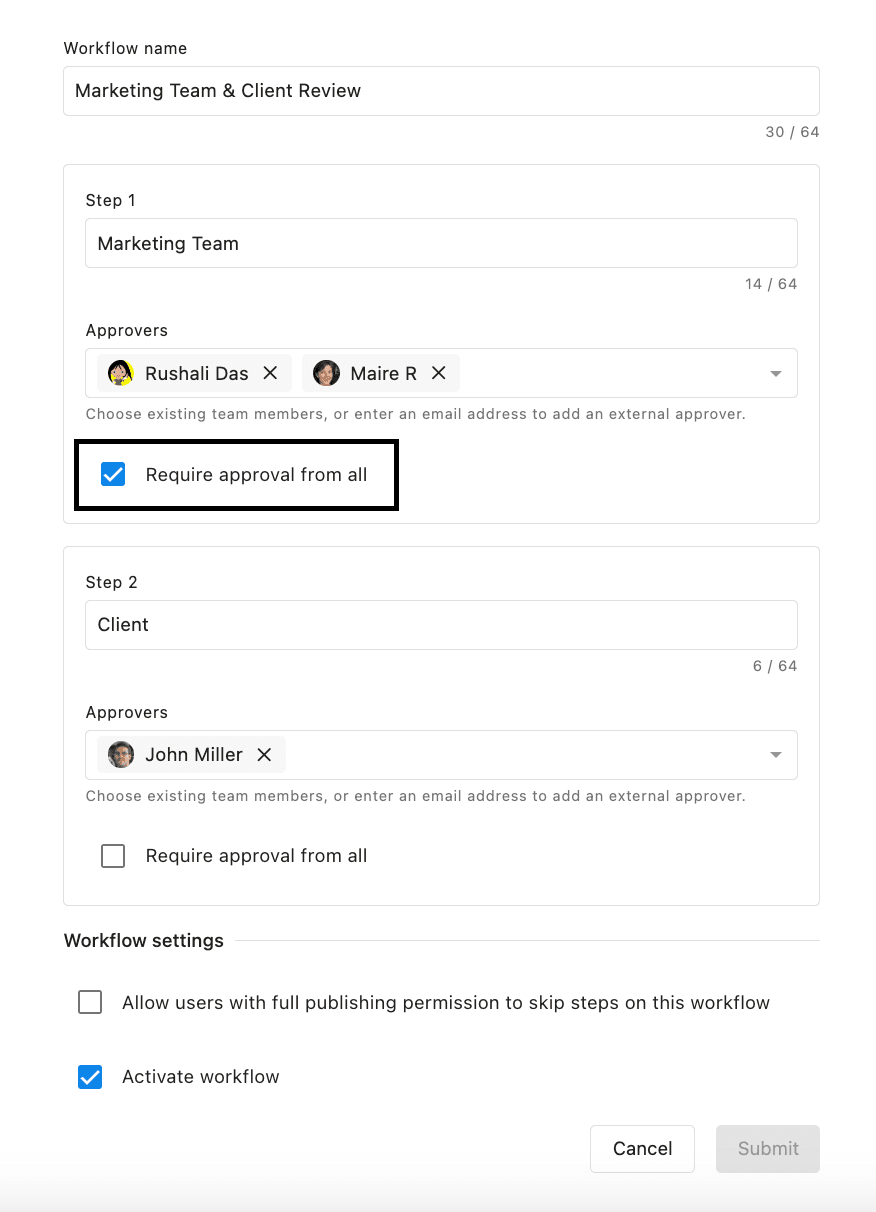 Previously, a post could move forward once any approver in a step approved it. Now, you can require that all approvers in a step must approve before the post advances to the next stage.