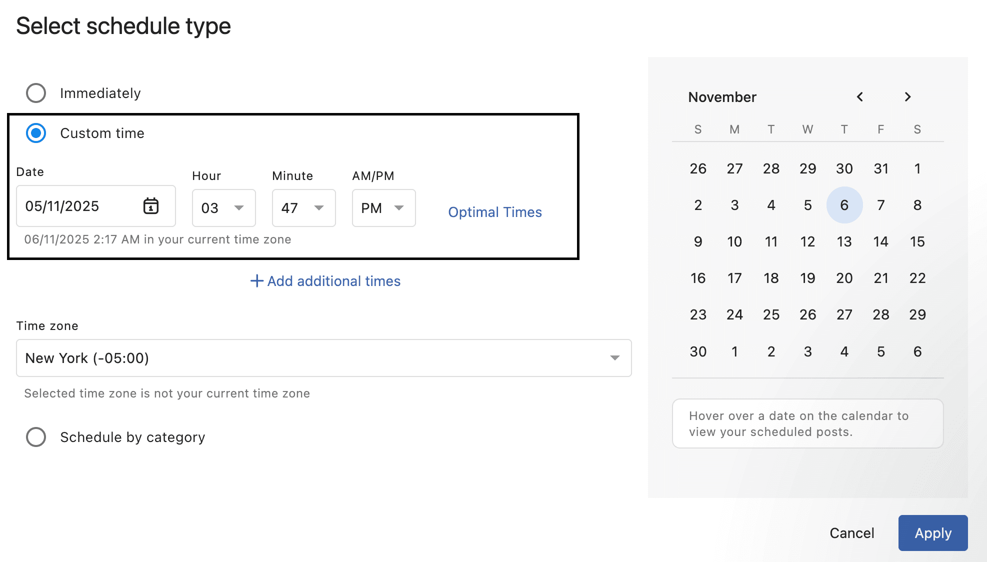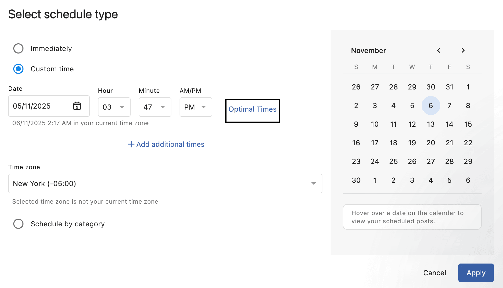 Optimal Times removes the guesswork from scheduling by suggesting posting times based on historical engagement data, helping you publish when your audience is most active.