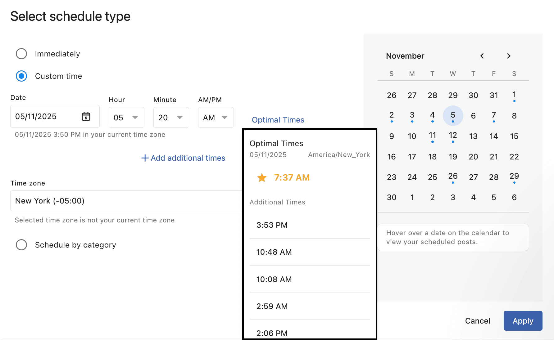 You’ll see a list of suggested posting times for the selected date and timezone. The highest-ranking time is shown at the top, marked with a yellow highlight and a star icon. This is the best time to post for that date, based on available data. Below that, you’ll see a list of Additional Times. All other time slots in the list are also good options, but are ranked in descending order of engagement likelihood.