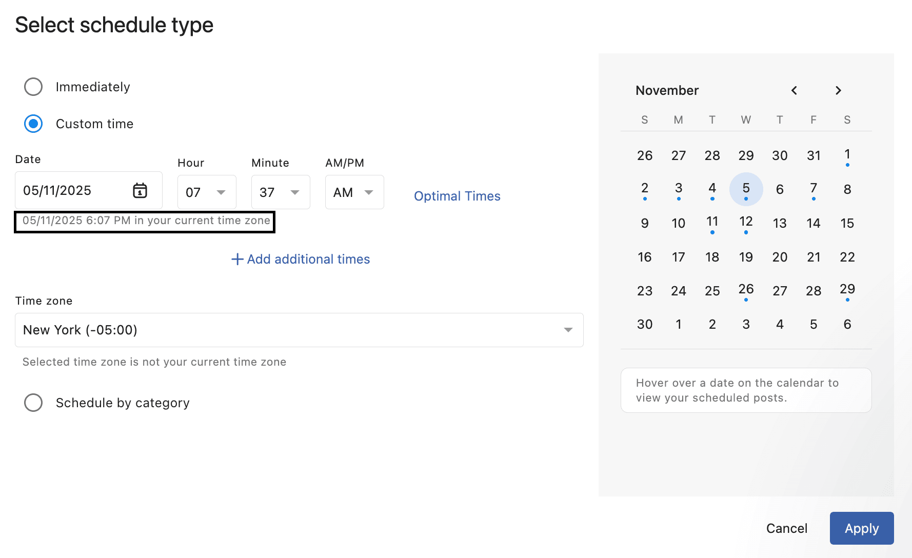 Click on any of the recommended times to add it to your post schedule. You'll also see the selected time displayed in your local time zone just below the time slot, so you can be sure of exactly when the post will go out.