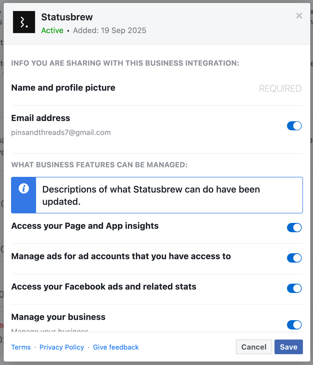You have enabled all the permissions for Statusbrew in Facebook Business Integrations