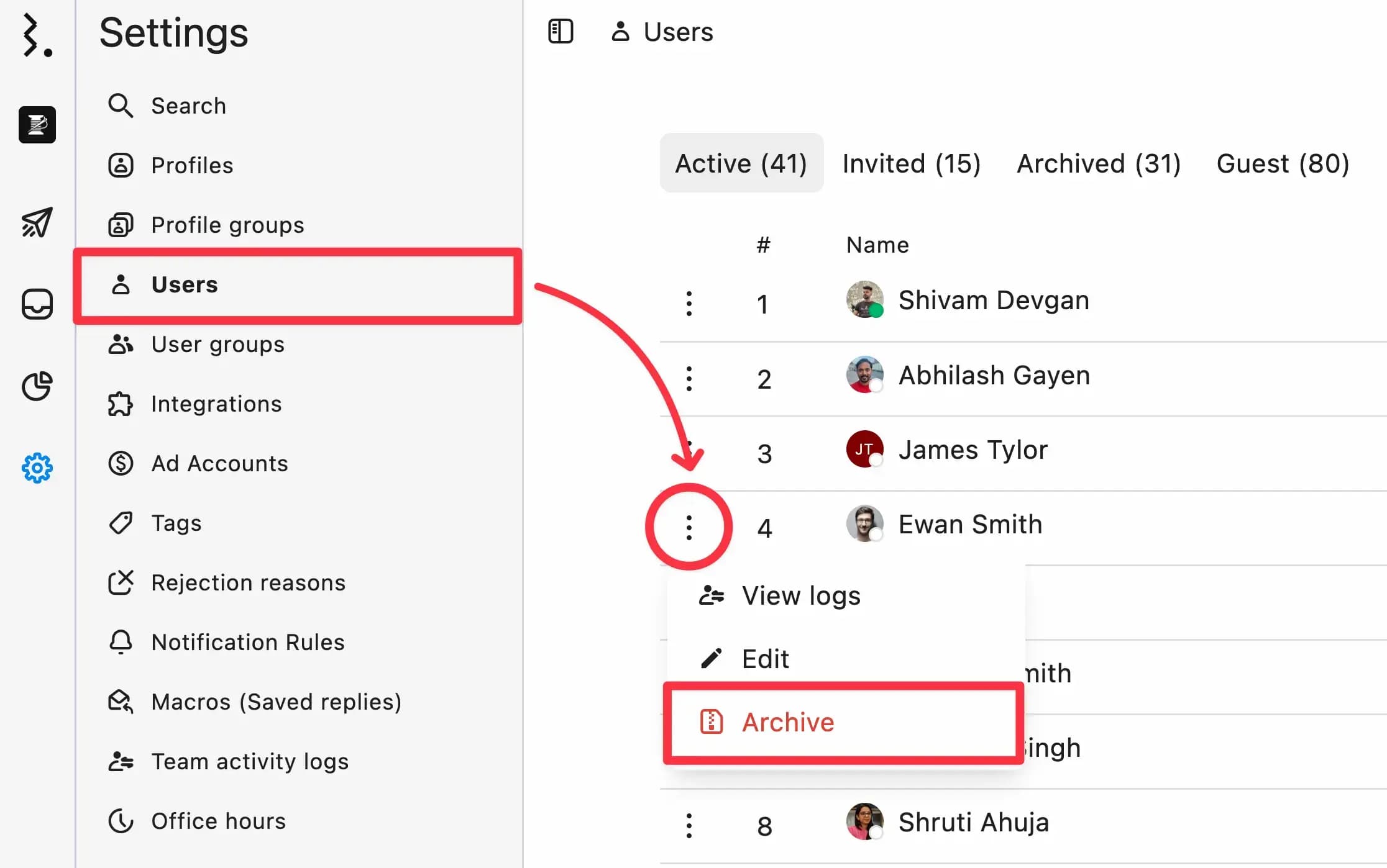When a team member leaves, archive their account to immediately revoke access while preserving their work history.