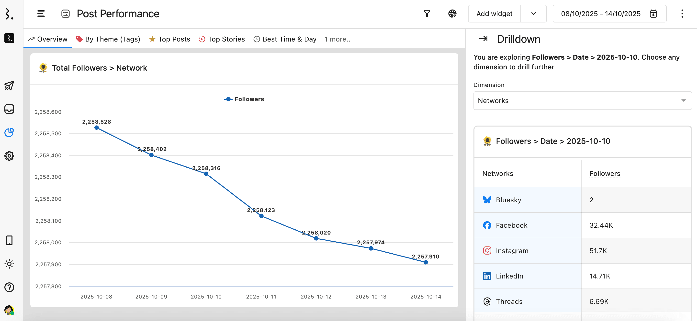 You can drill down by Date to analyze when your audience grew most significantly and correlate spikes with specific campaigns, posts, or events — giving you a clear understanding of what drives audience growth.