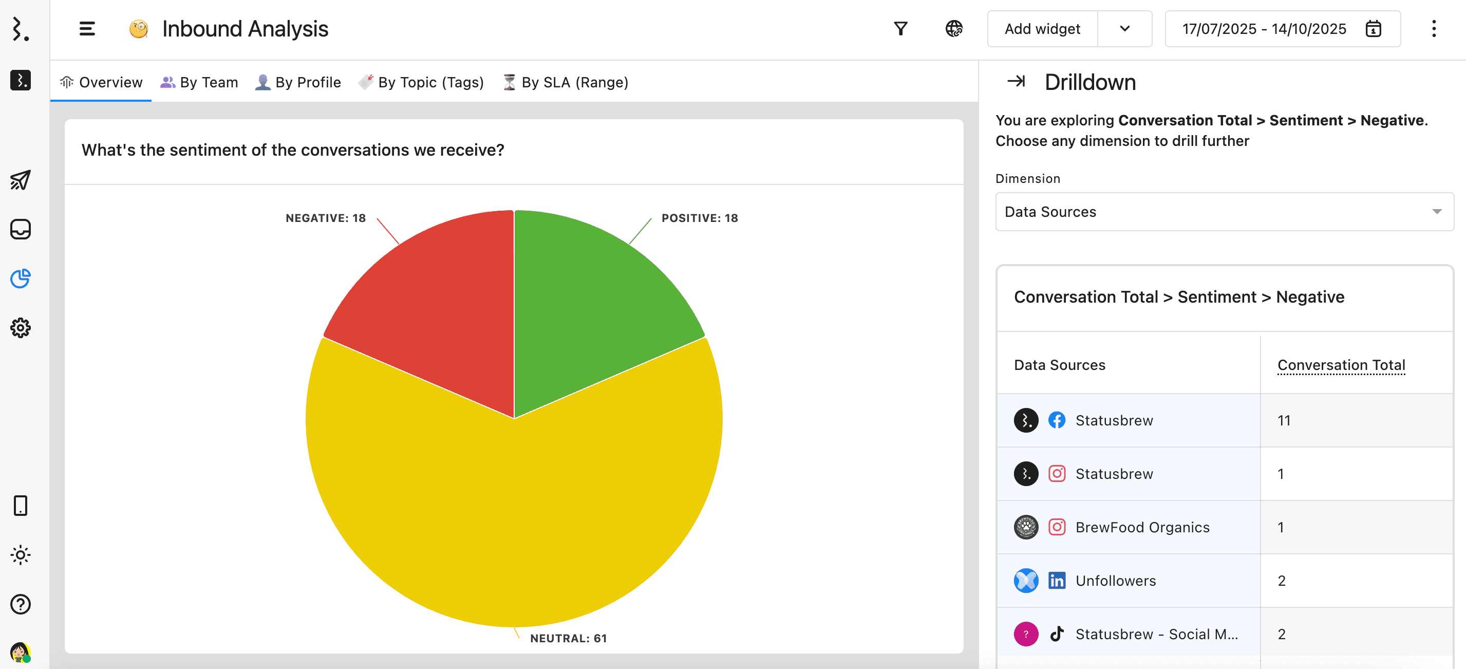 By drilling down by dimensions such as Data Source or Date, you can quickly identify which platforms or time periods are driving the most negative sentiment — helping your team act faster to address issues or optimize communication strategies.