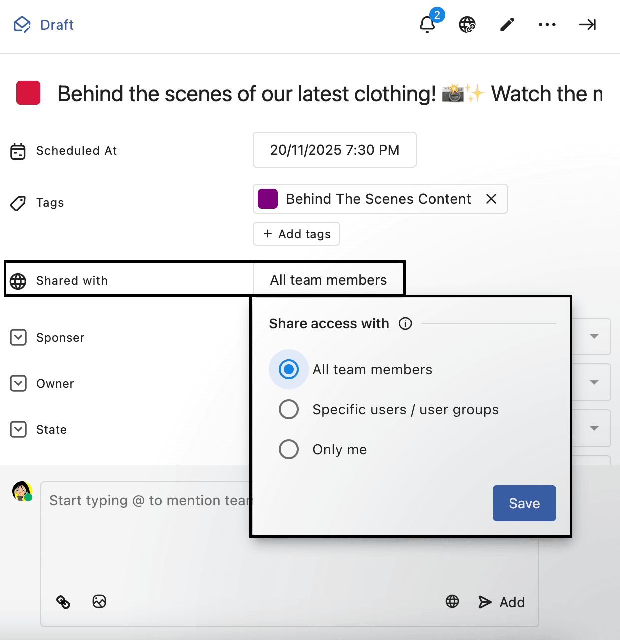 Click on a post to open it in Post Detail. You will be able to view the Shared with settings of the post in Shared with. Click on it to change the Share access with settings of the post. This option is editable only by the user who created the post.