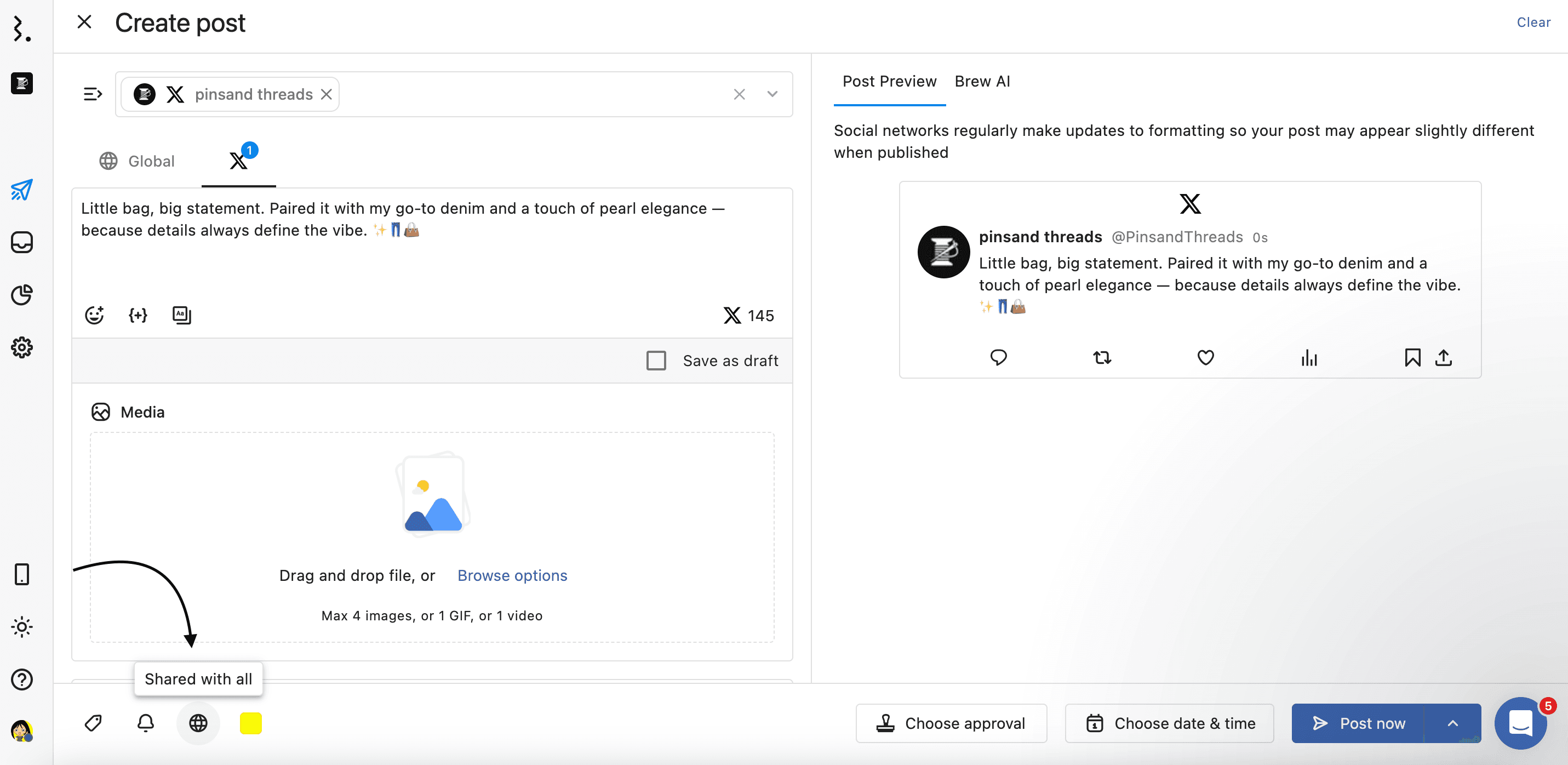 Statusbrew lets you easily manage post visibility by selecting specific users or user groups to share posts with. By default, a post you create is shared with everyone; you can use this option to restrict it.