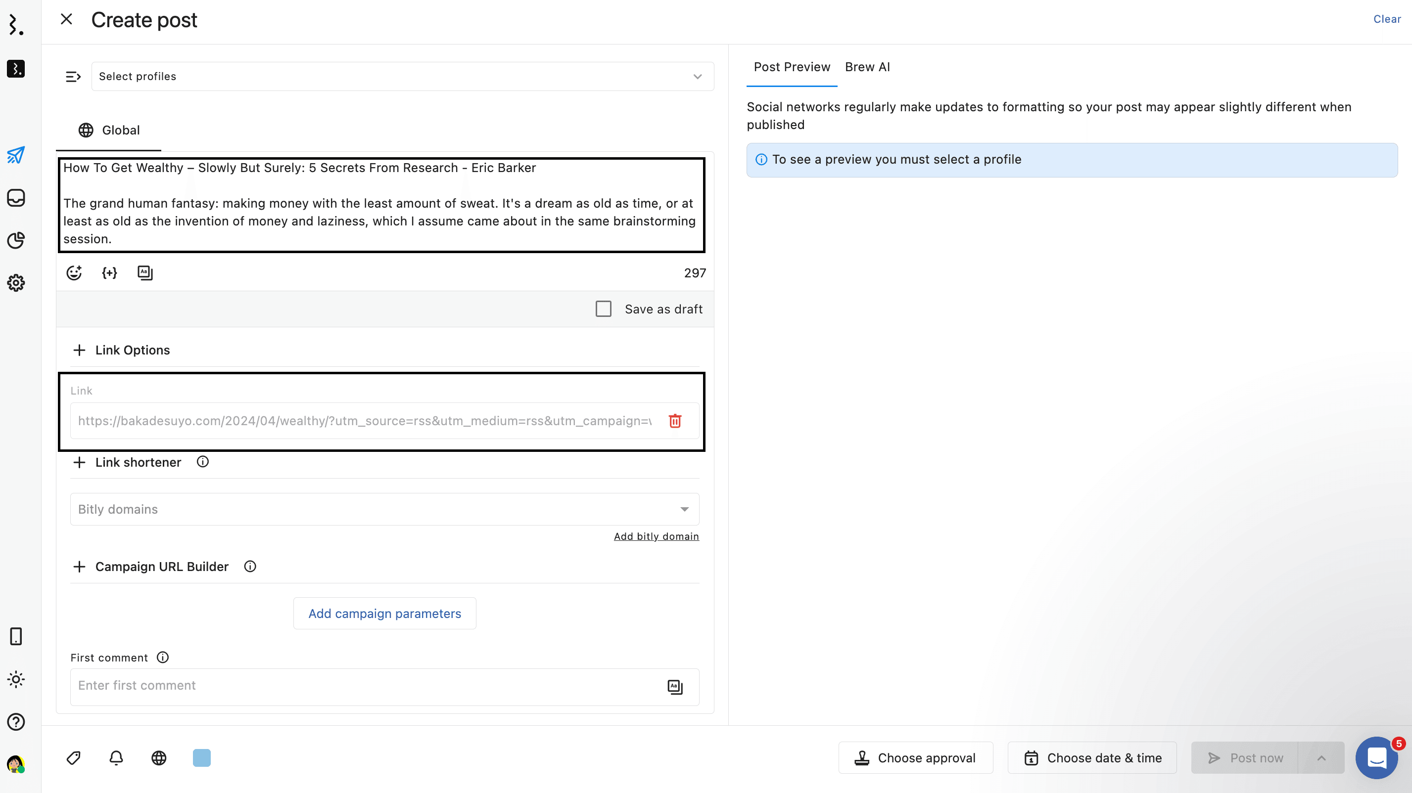 Select Copy to compose. The Create post window will open with the article’s content copied in the caption box and the article link added. You can also take the help of Brew AI to refine your caption.