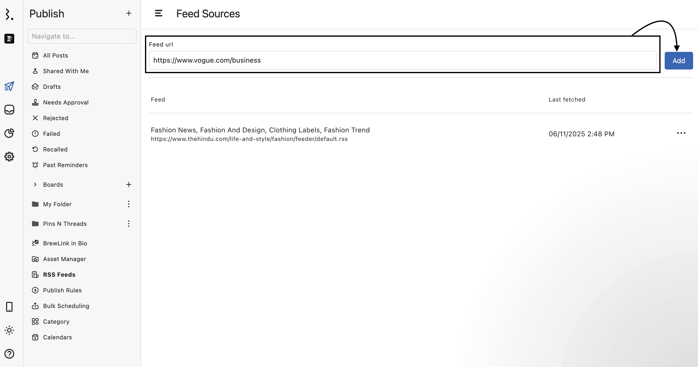 Once added, RSS feeds are available to Statusbrew users in your organization, making it easy to manage, curate, and distribute fresh content consistently.
