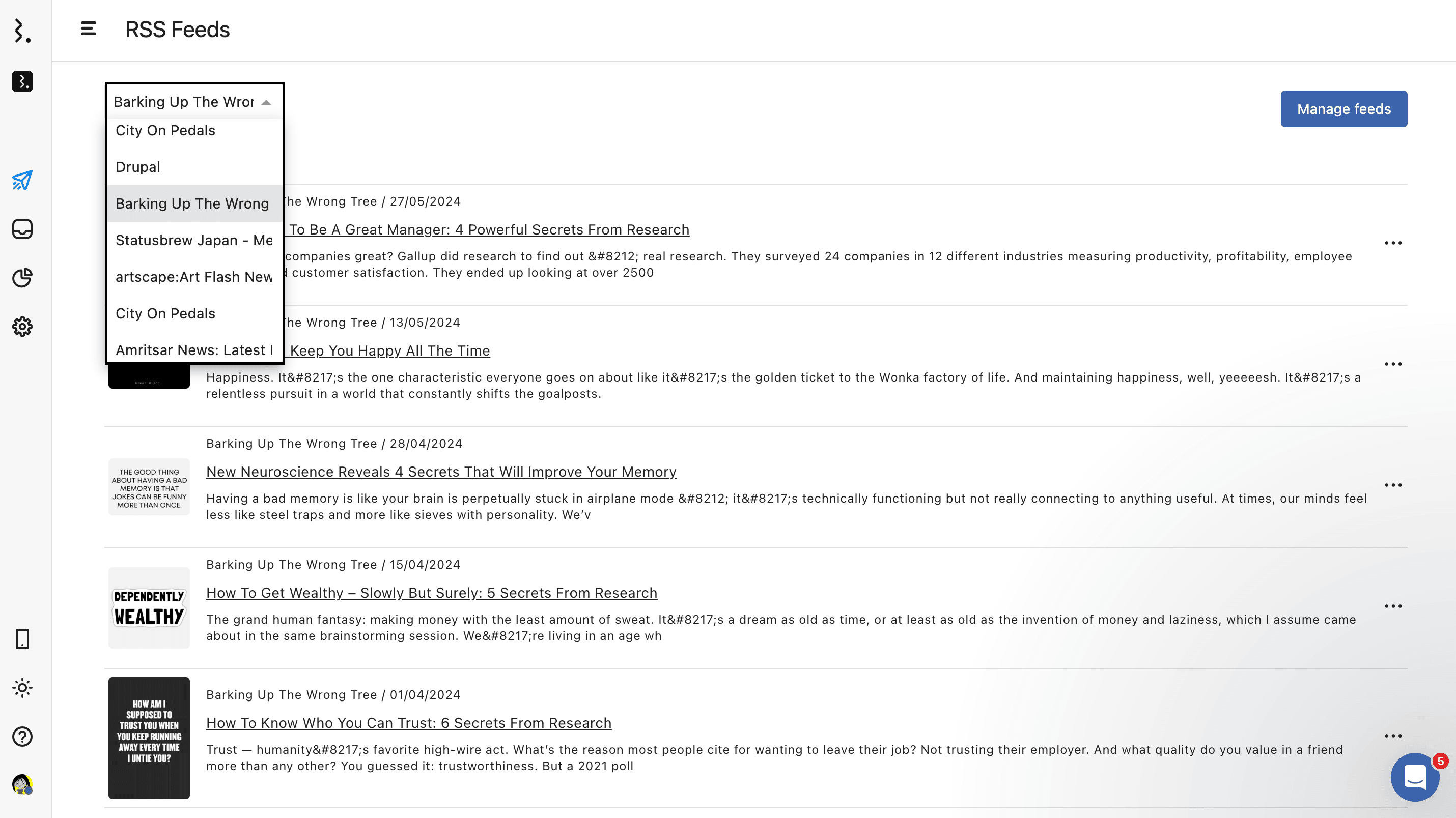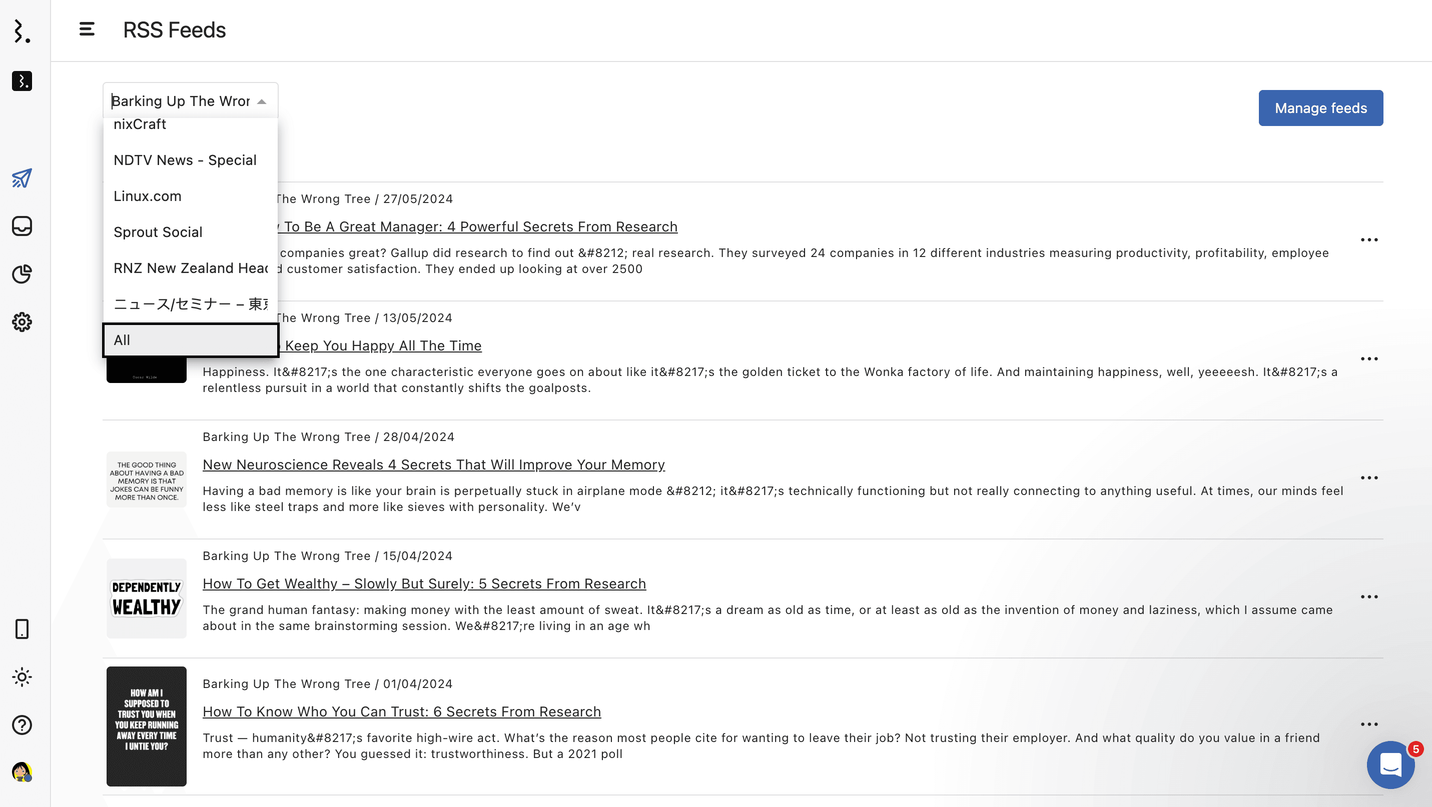 Below the filter, you’ll see a chronological list of articles pulled from the selected RSS feed.