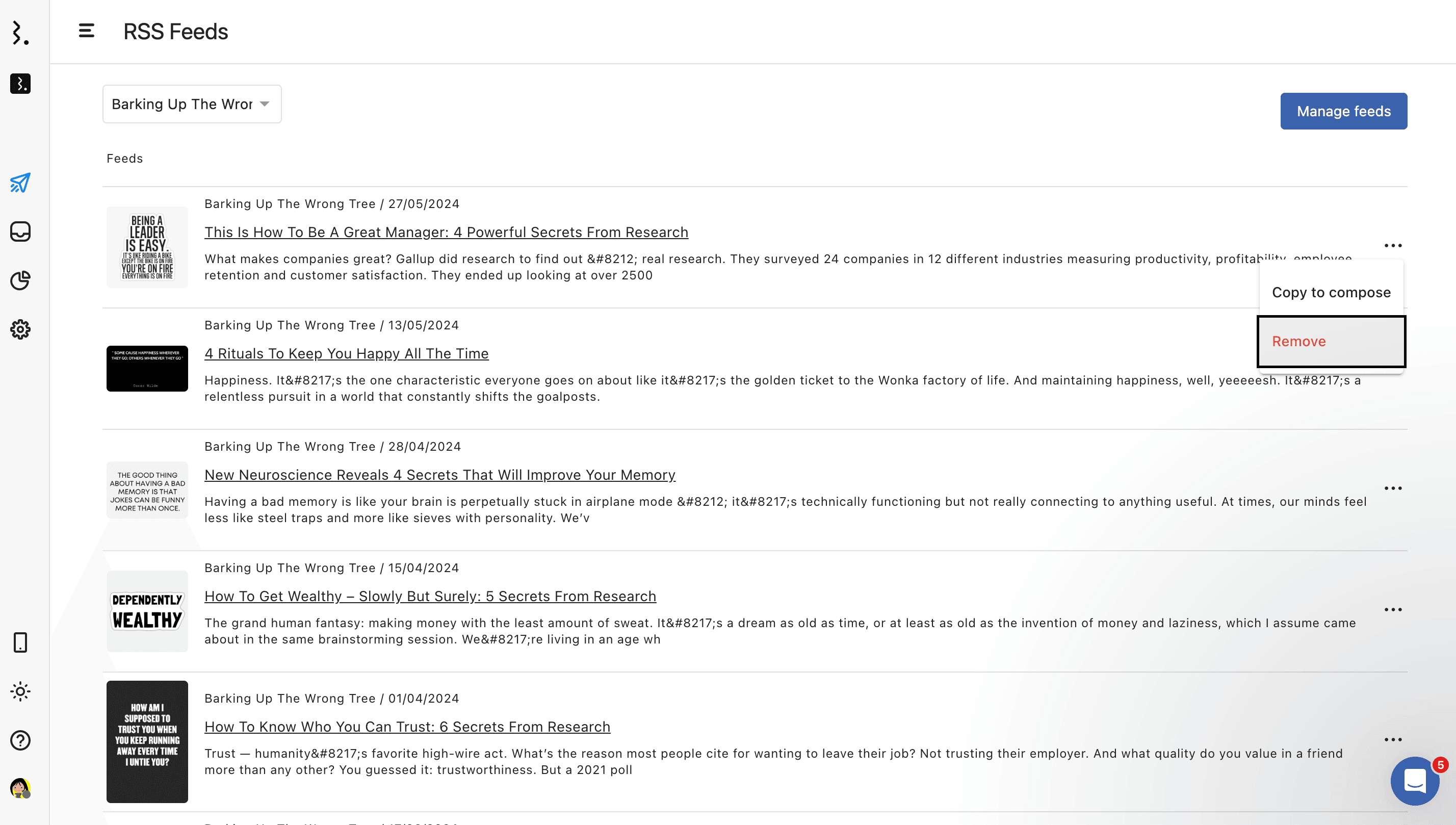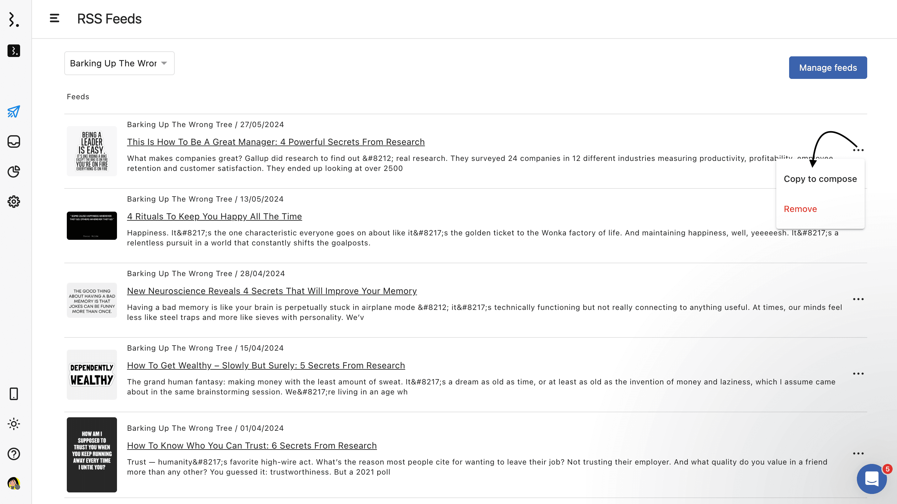 In the Feeds Inbox, find the feed you want to create a post out of and click next to it.