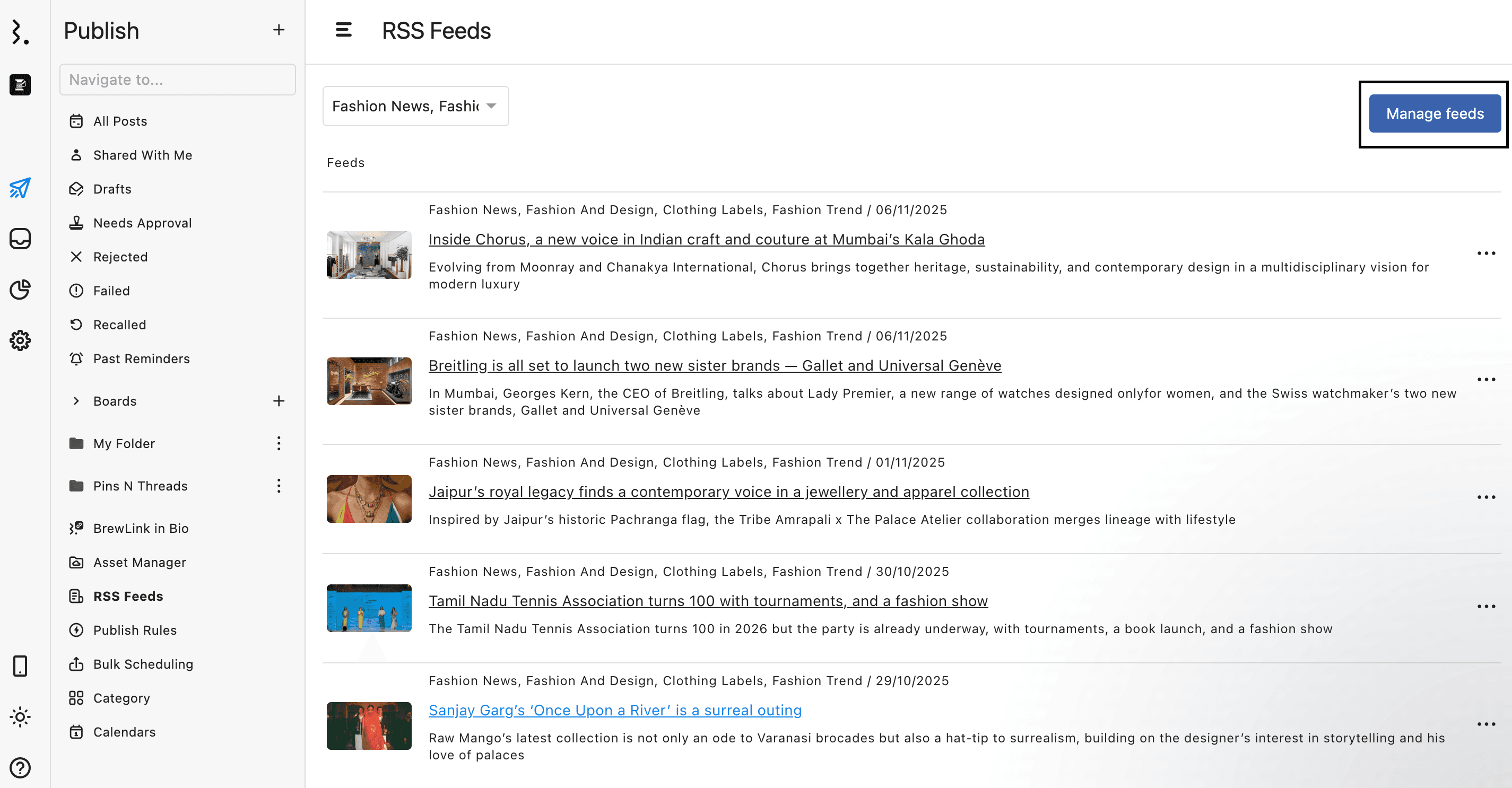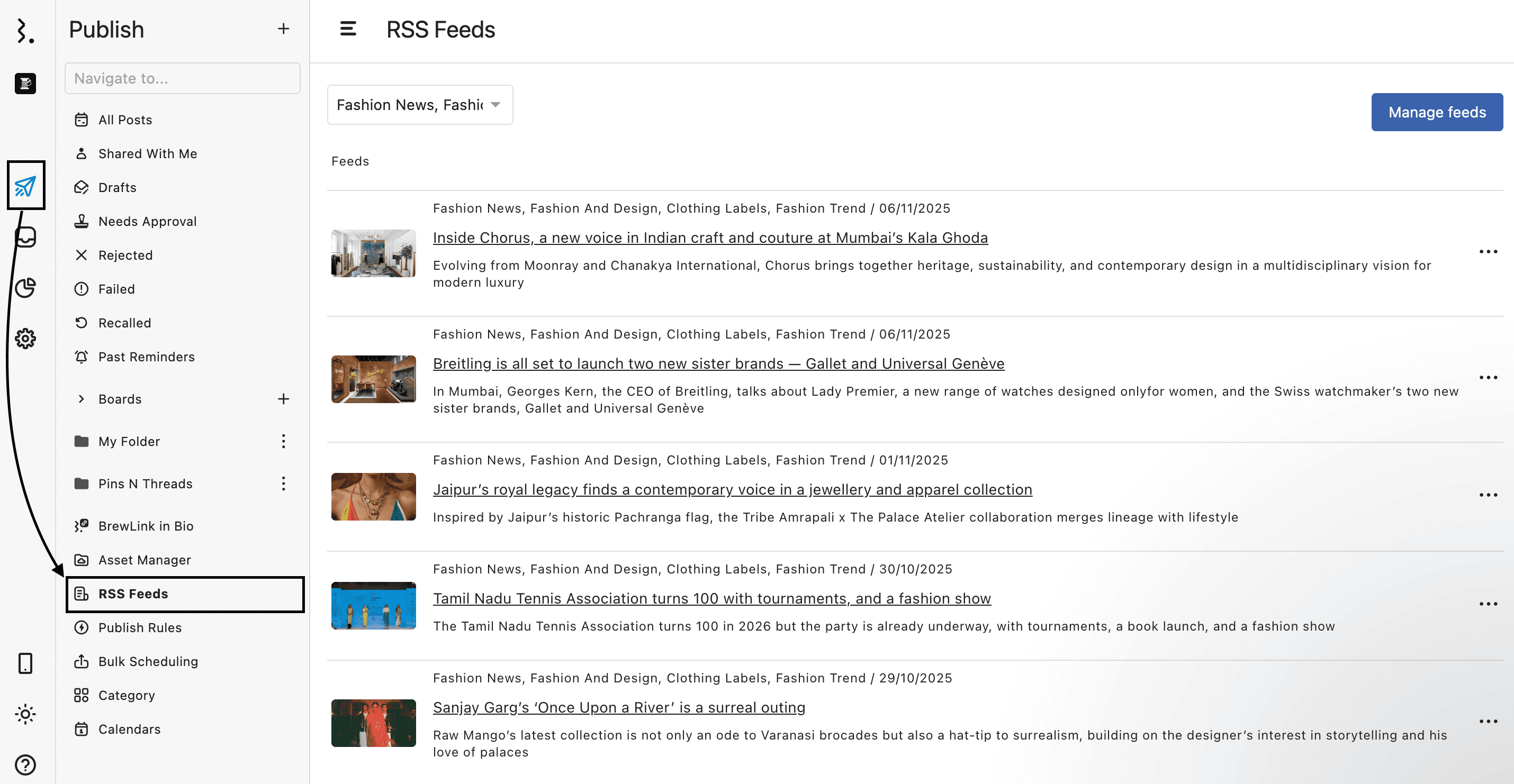 Navigate to Publish from the Statusbrew dashboard and select RSS Feeds from the sidebar.