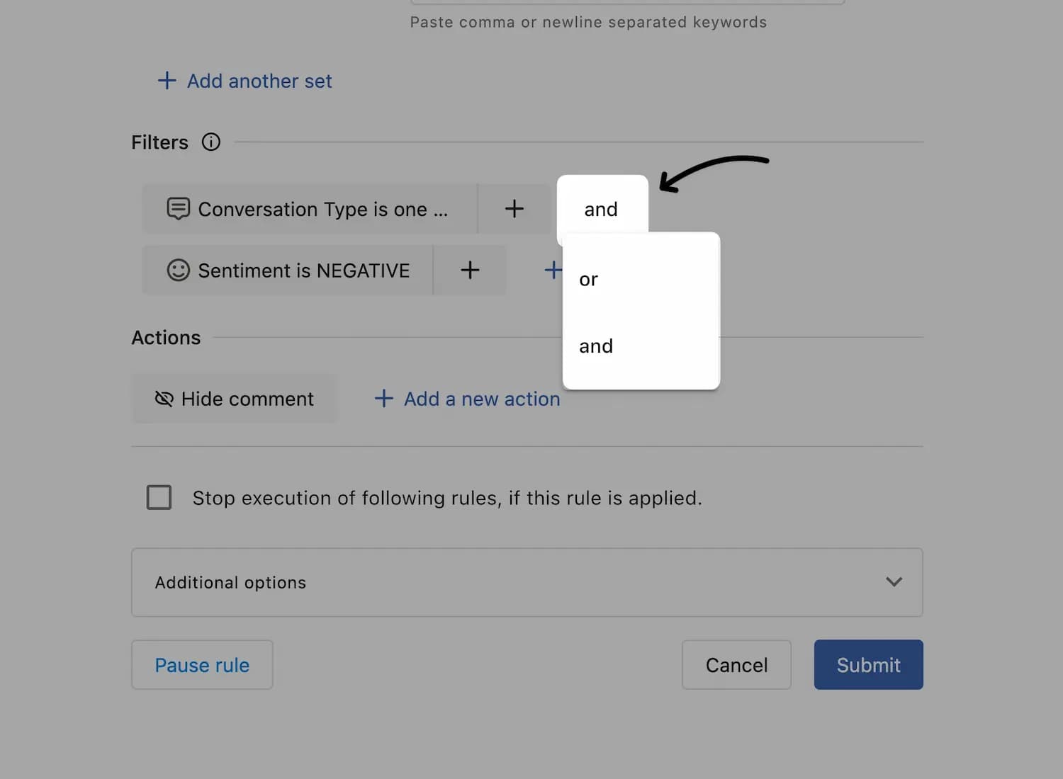 Filters define the specific conditions under which your rule should be triggered. They help you fine-tune how and when a rule is applied based on message content, type, source, sentiment, and more.