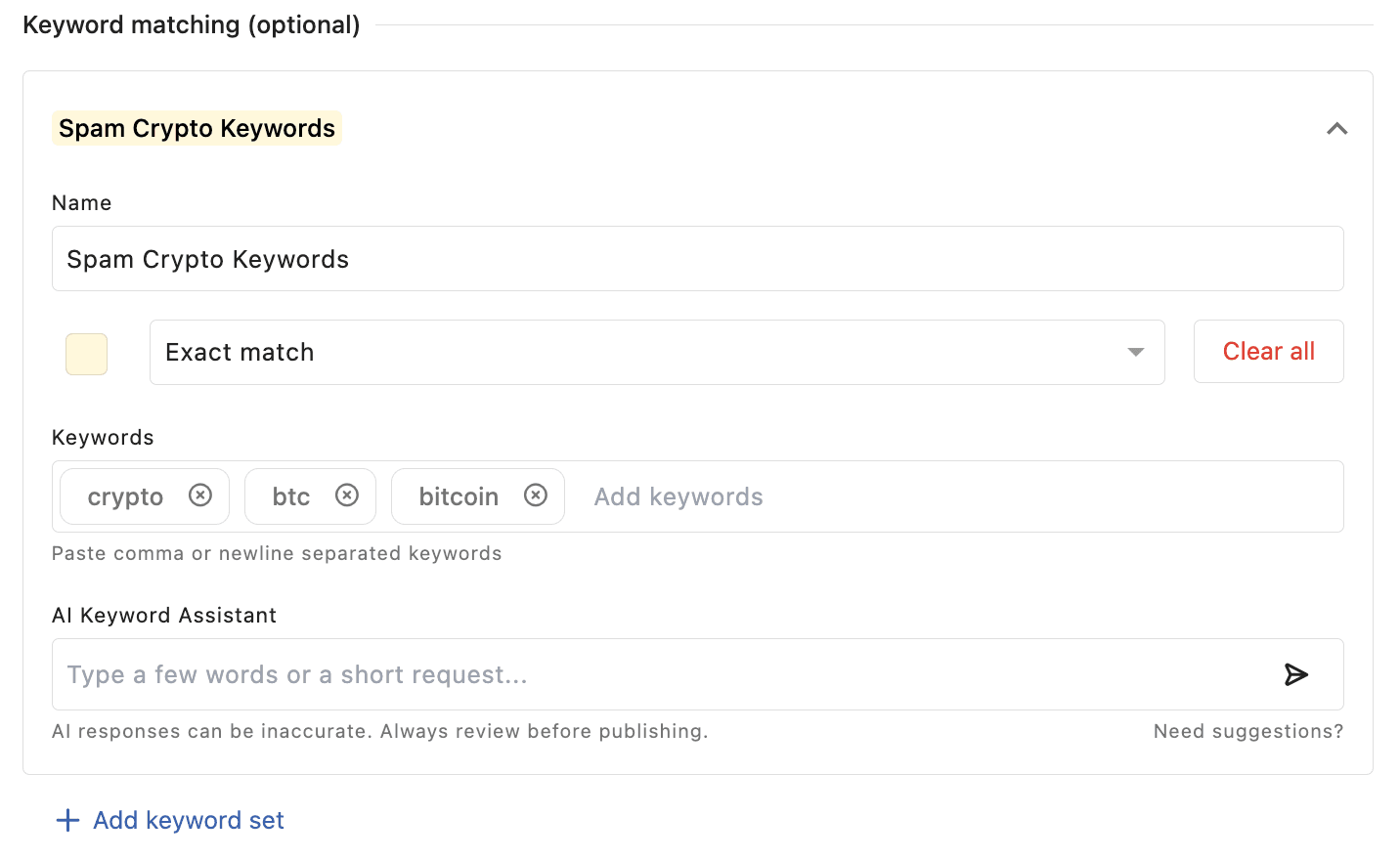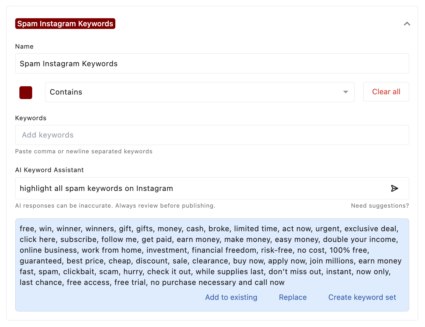 Just type in a few words or a quick prompt (e.g., “highlight all spam keywords on Instagram”), and the AI will suggest a comprehensive list of matching terms you can use.