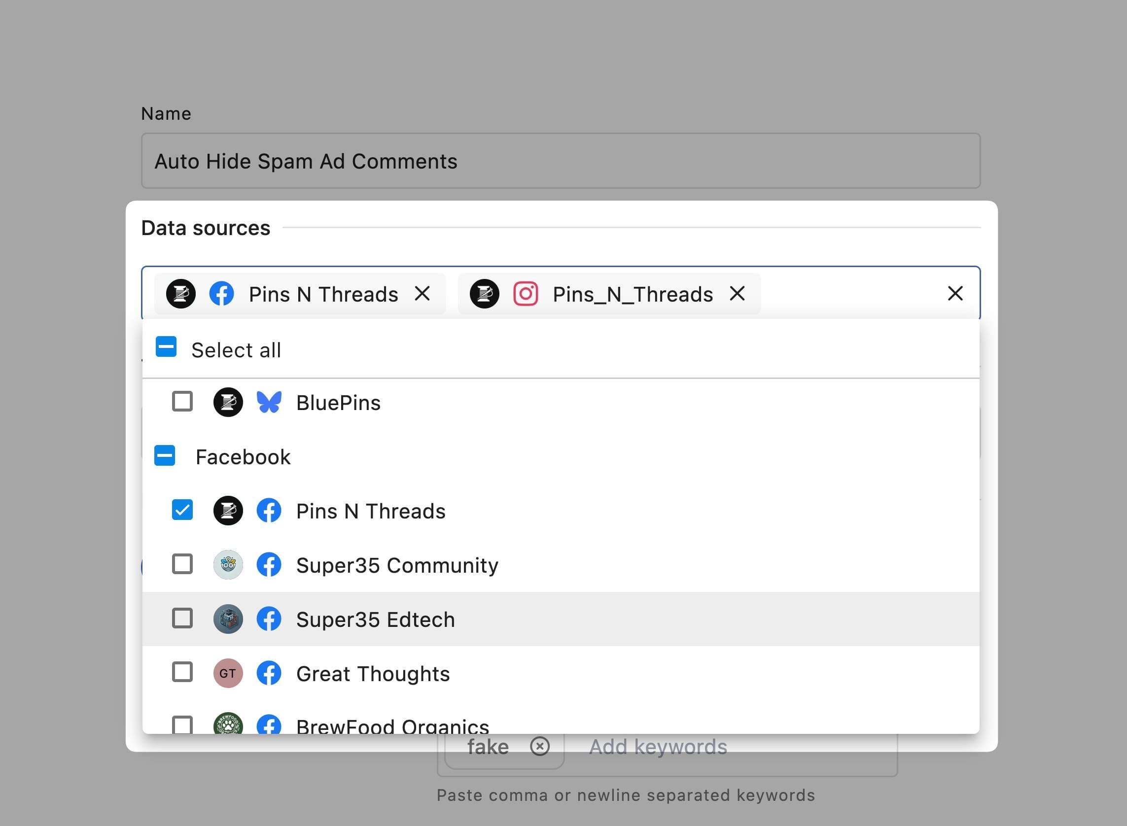 The data source determines where the rule will be applied. You must select at least one social profile — a rule cannot be created without this.