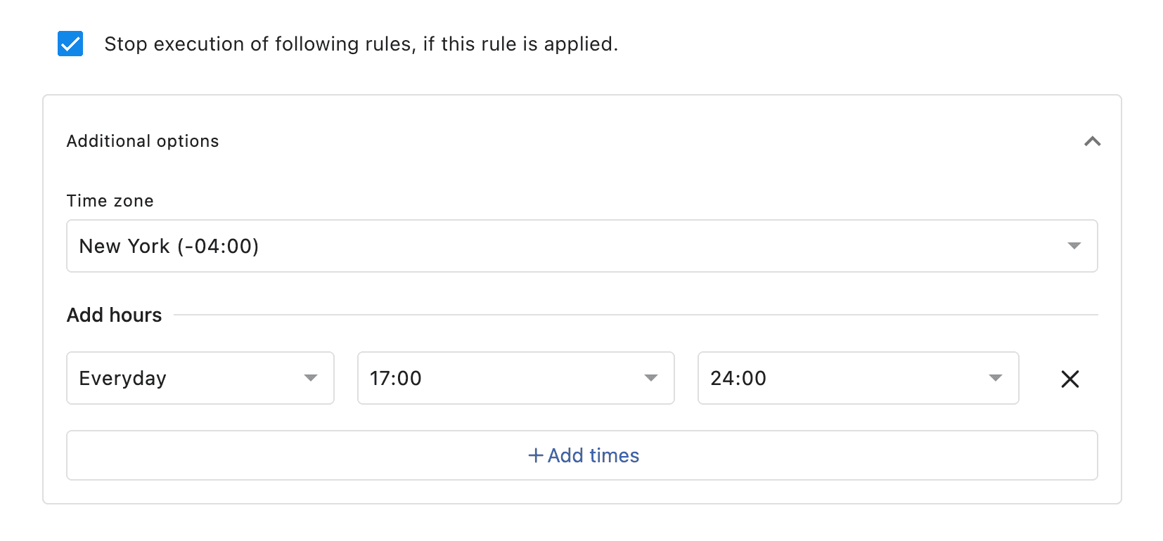 Under Add hours, choose the day and define the time range during which the rule should be active, for example, Monday from 09:00 to 17:00. You can specify multiple days and time blocks by clicking Add times.