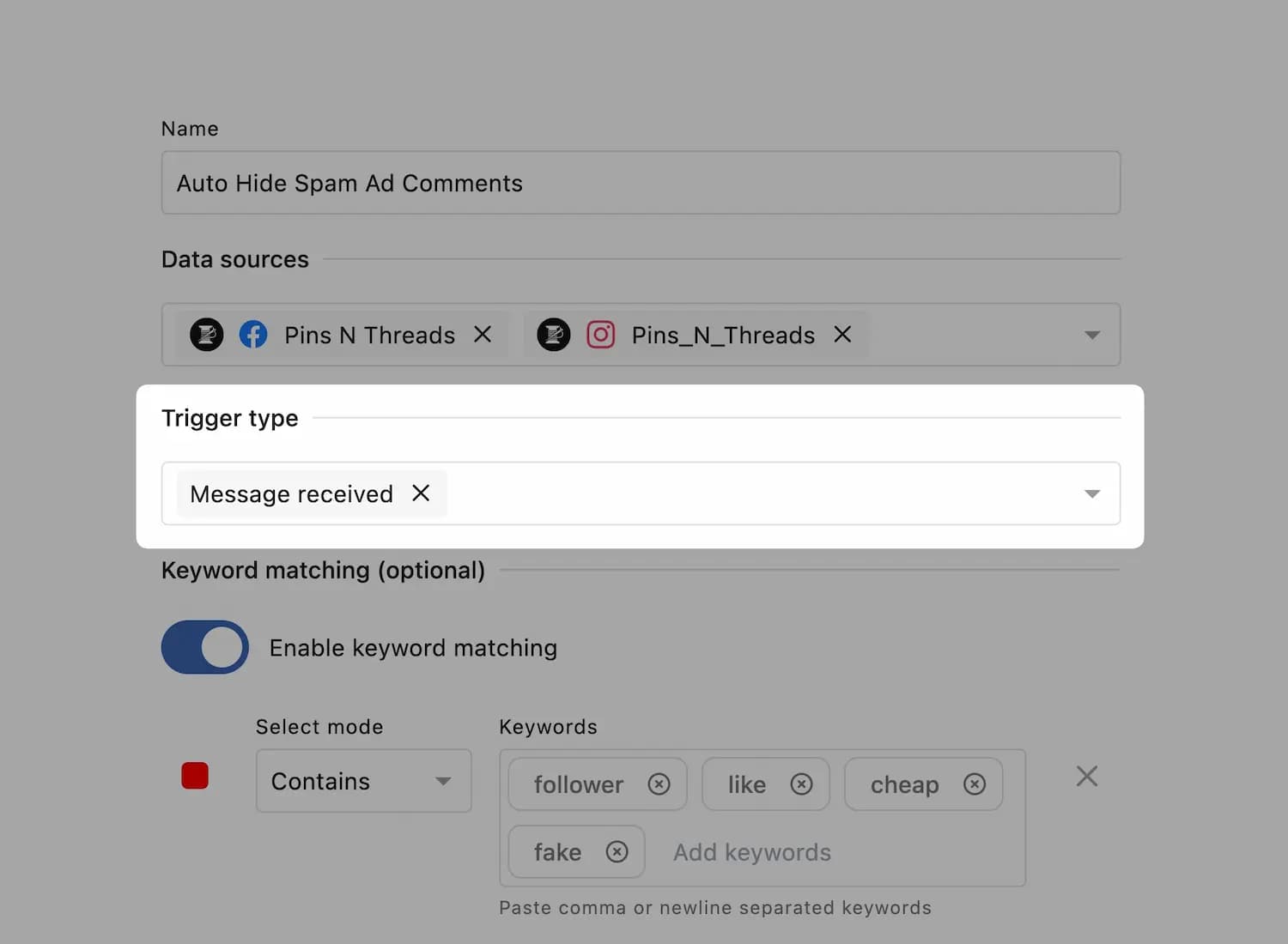 Spam Filtering: Add keywords like “win,” “prize,” “free money,” “crypto,” “click here,” and highlight them in red to help your team instantly spot spam comments or scam DMs that slip.