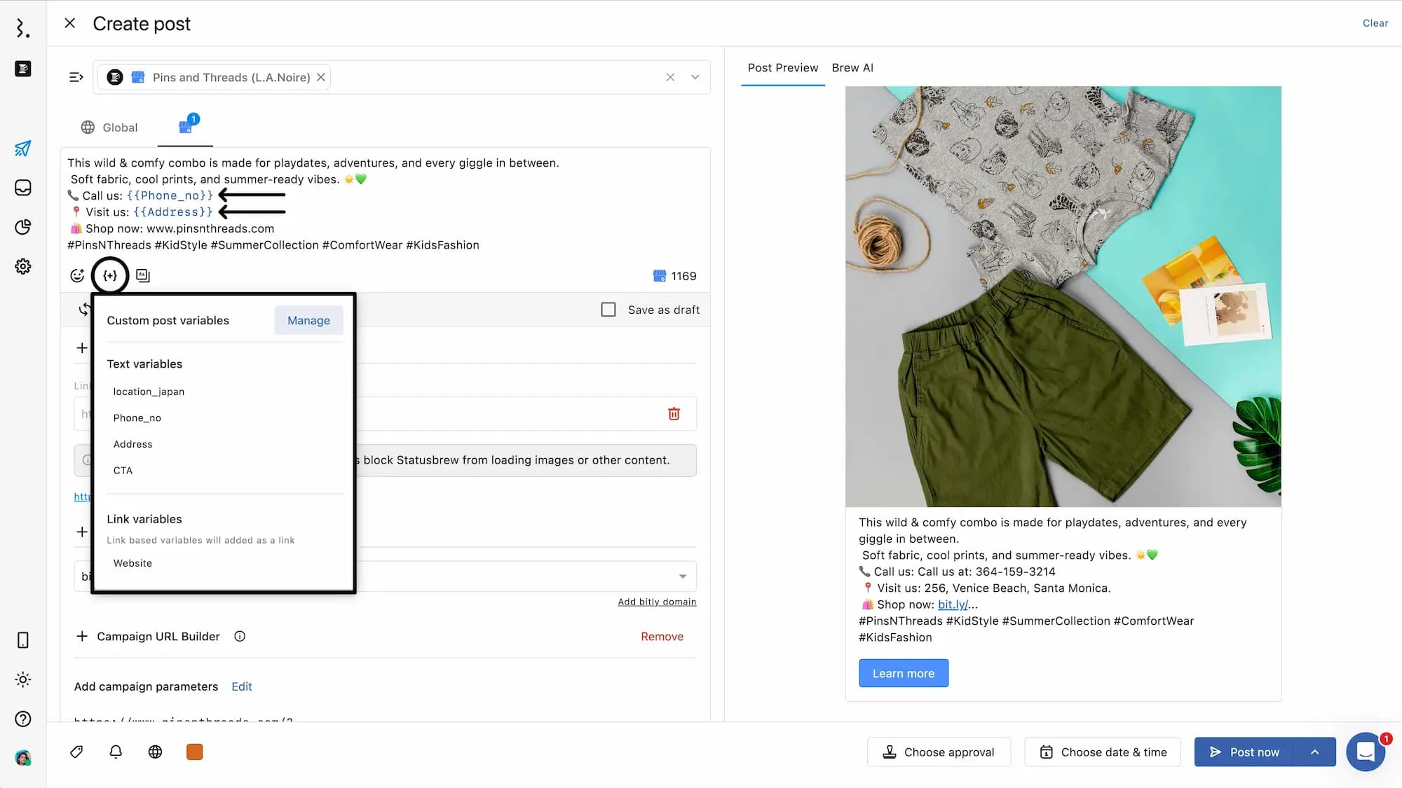 {{website}}custom post variable and have default link presets set in Statusbrew, the same campaign parameters will apply to links in all posts. You can edit the campaign parameters for individual posts from Planner once scheduled.