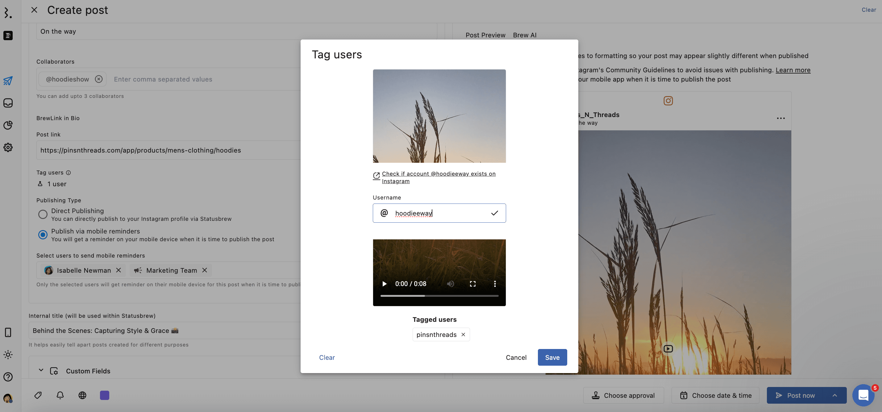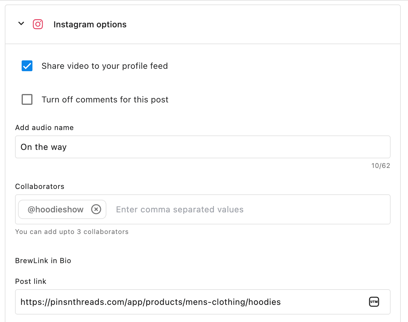 Add Post link from your BrewLink in Bio site. When the Reel is published, the post will appear on your BrewLink in Bio site with the post link added to drive traffic from your Instagram bio page. BrewLink in Bio is Statusbrew's Link in Bio tool. Statusbrew's BrewLink in Bio allows you to create a customized BrewLink site that is a clickable replica of your Instagram grid with unique links attached to each Instagram post.