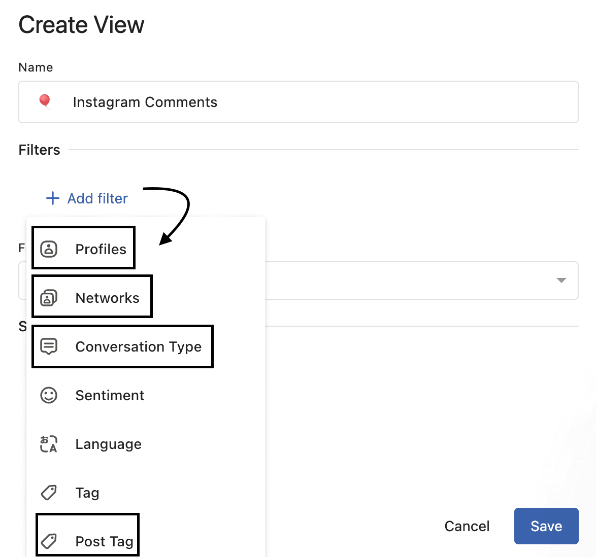 Comments left on your Instagram Reels will appear in the Engage Inbox. Comments on Reels appear as any other Instagram post in Engage. You can filter conversations by Profiles, Networks, or Conversation Type (Instagram Comments) to see messages on your Instagram Reels post. Alternatively, you can add a Post tag > Instagram Reels to your Reel post before publishing and filter conversations by Post Tag to specifically find comments on your Reel posts.