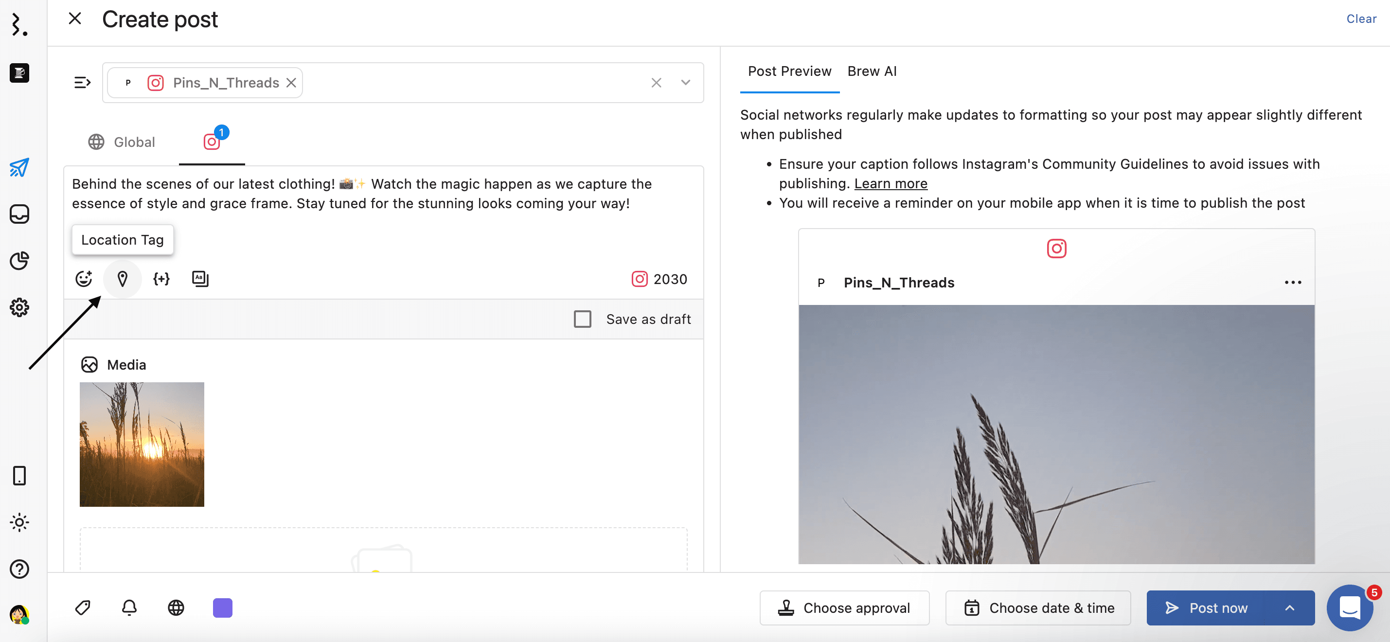 Add a caption (up to 2200 characters). You can also use Brew AI to write or refine the post caption.