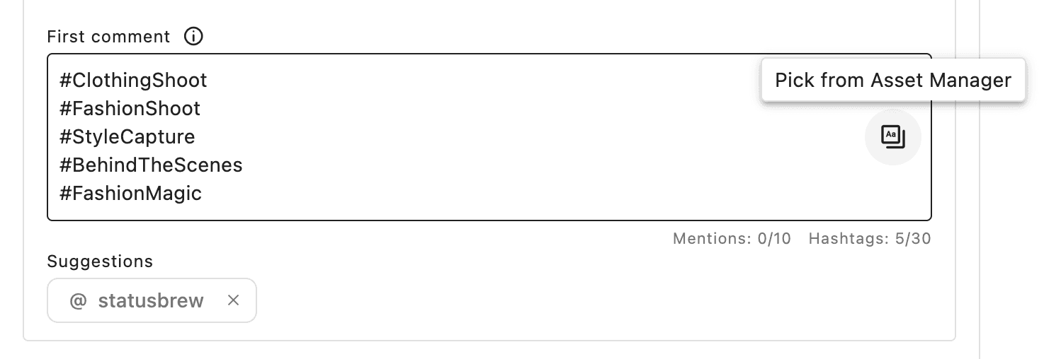 Schedule First comment to publish alongside your hair post — ideal for including hashtags, links, or follow-up messages without crowding the main caption. You can also add saved hashtags by selecting Pick from Asset Manager. You can add upto 10 mentions or 30 hashtags in the first comment.