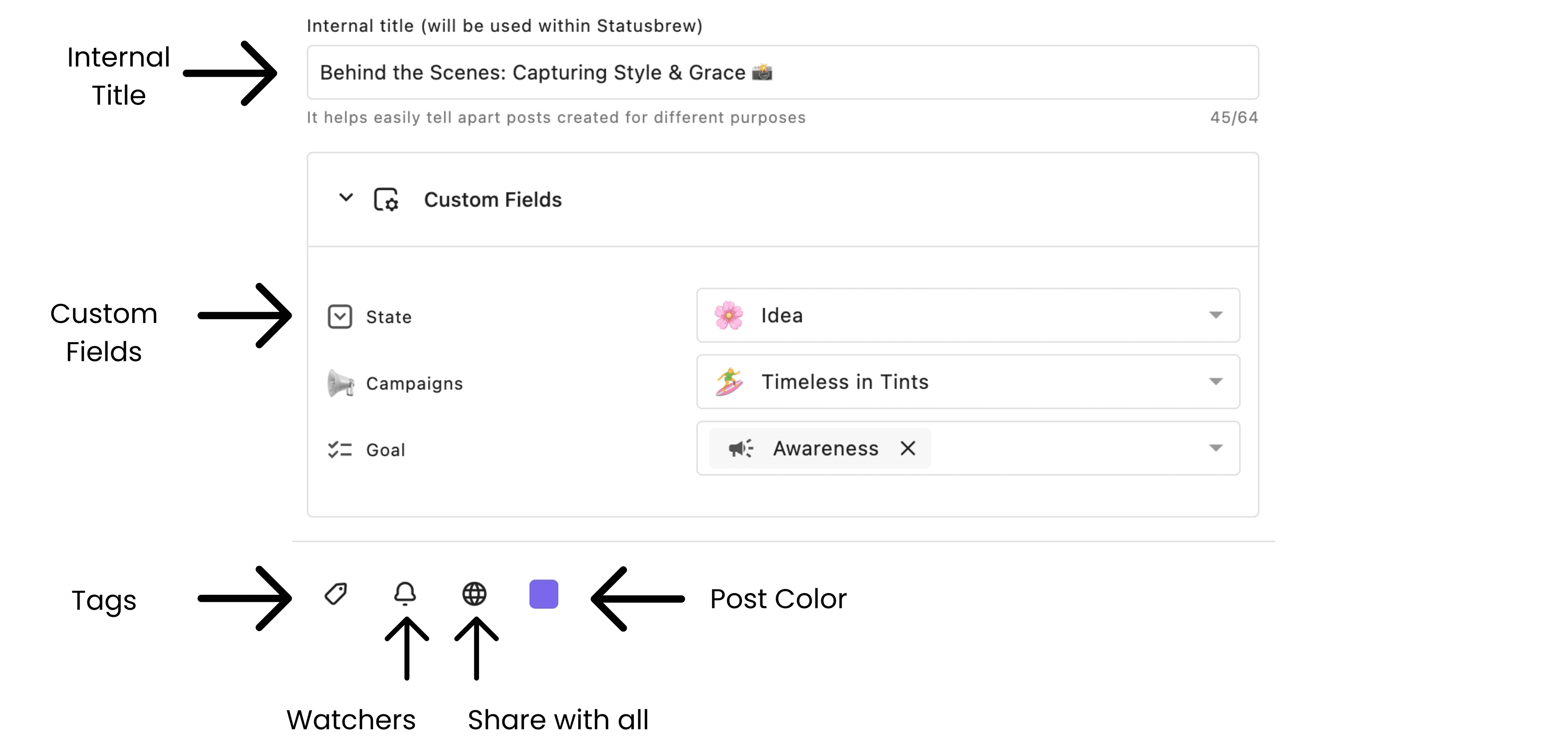 The Internal Options of a post in Statusbrew allow you and your team to add important internal context and organization to each post without affecting what’s published externally.