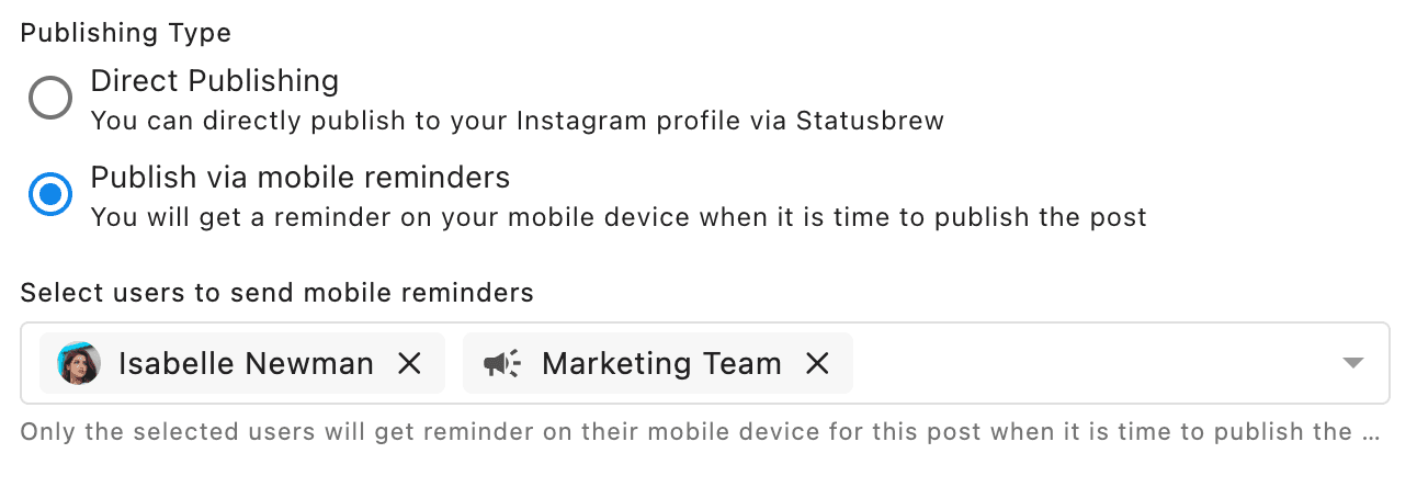 Select user(s)/user group(s) to send mobile reminders for Publish via mobile reminders method, ensuring the right person receives the alert to post on time. Only the selected users will get a reminder on their mobile device when it is time to publish the post. If not selected, all the users with publishing access will get a reminder on their mobile device for the post.
