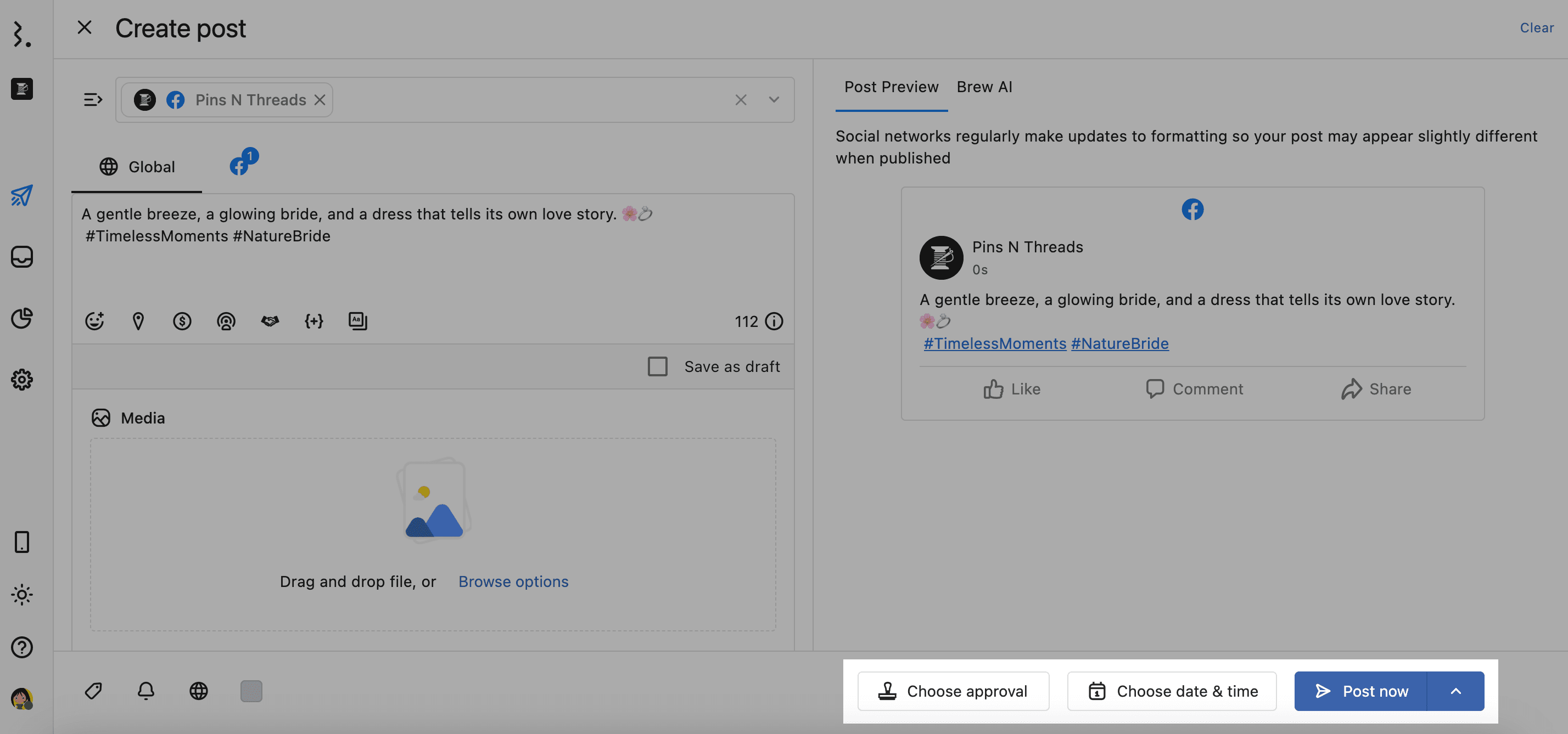 You can also upload media to make your posts engaging. You can drag files from your computer or select Browse options to upload your media.