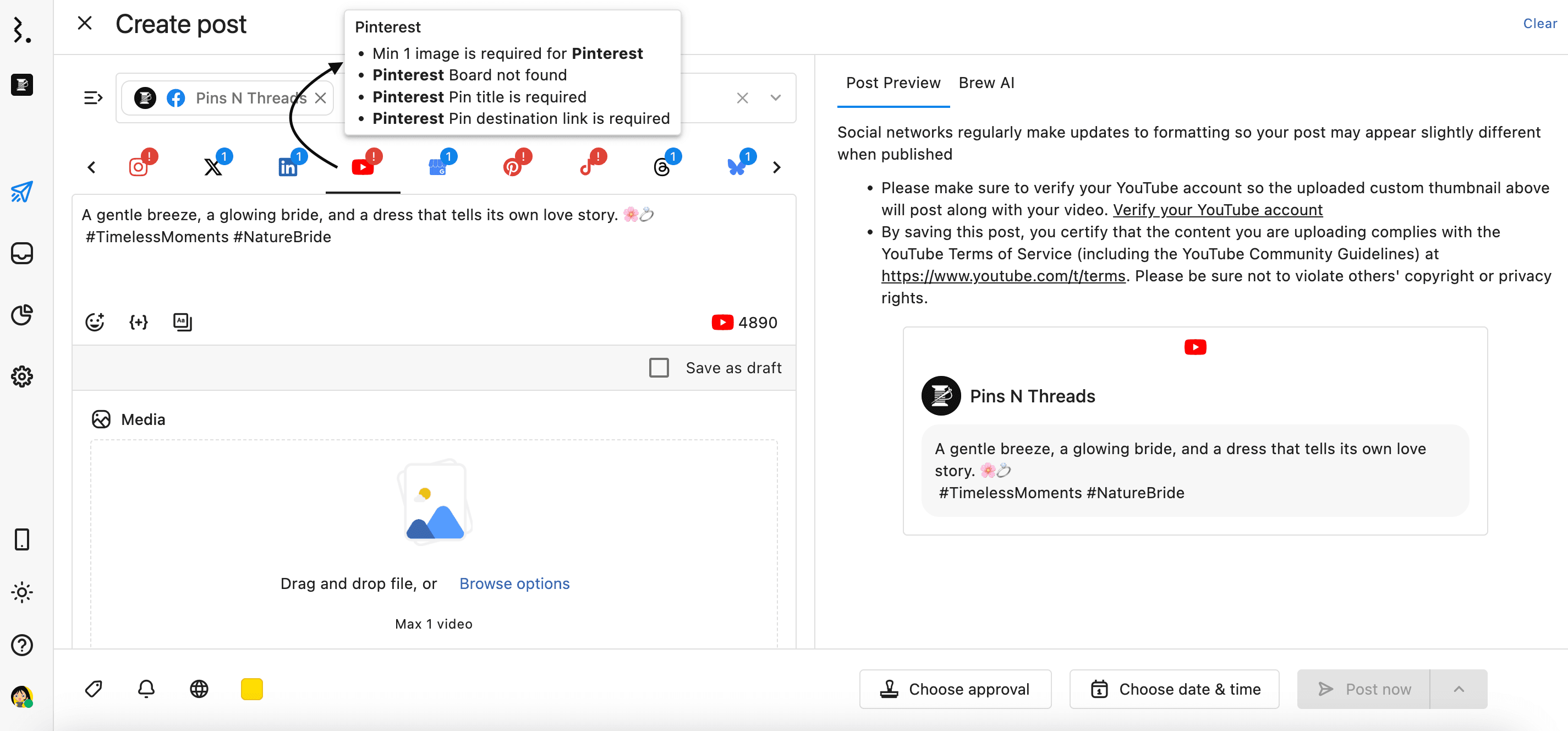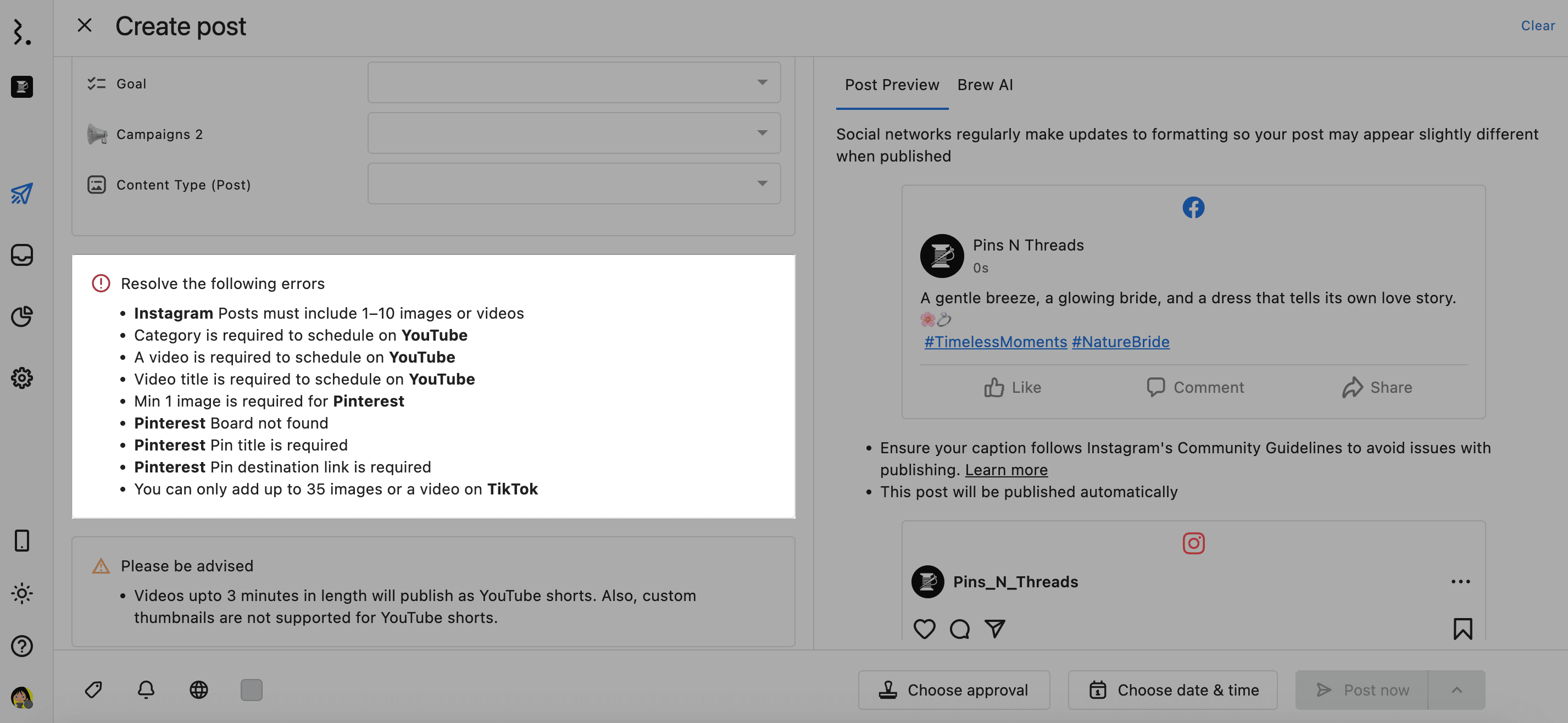 If there are any publishing requirements you haven’t met, you will also see network-specific error messages. These errors must be resolved before you can publish, schedule, or send your post for approval.