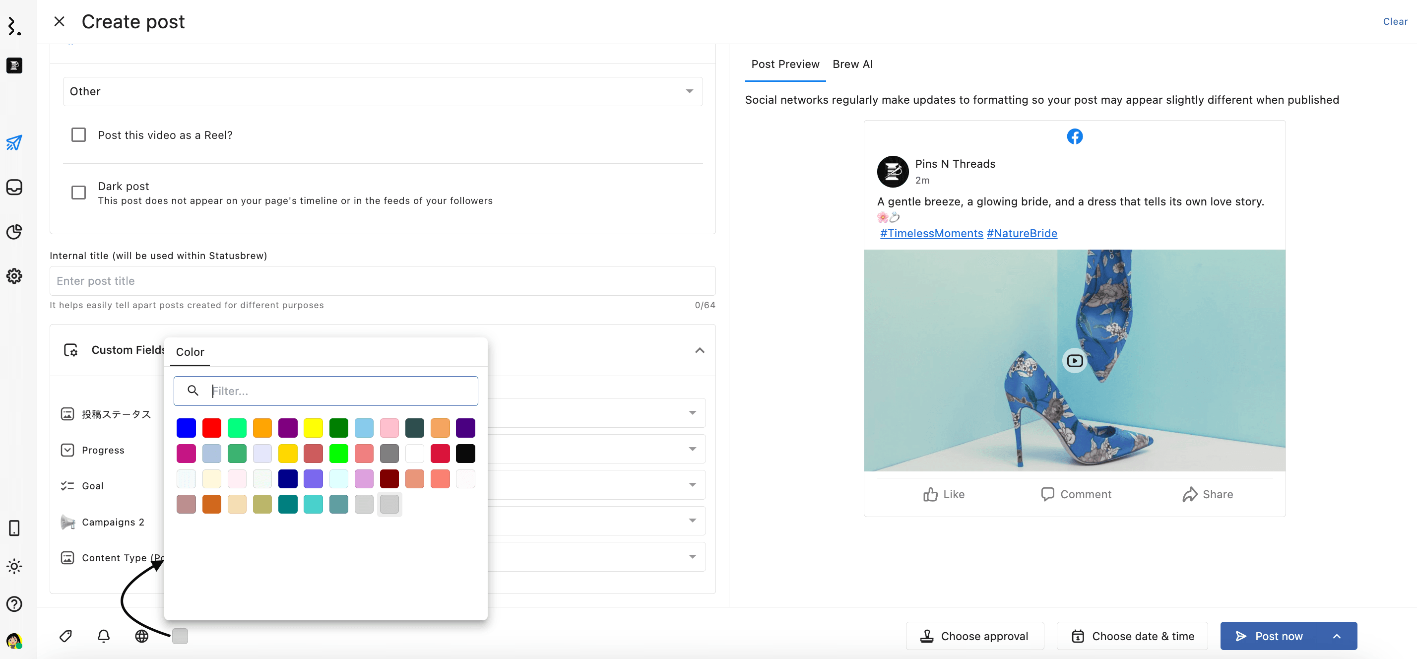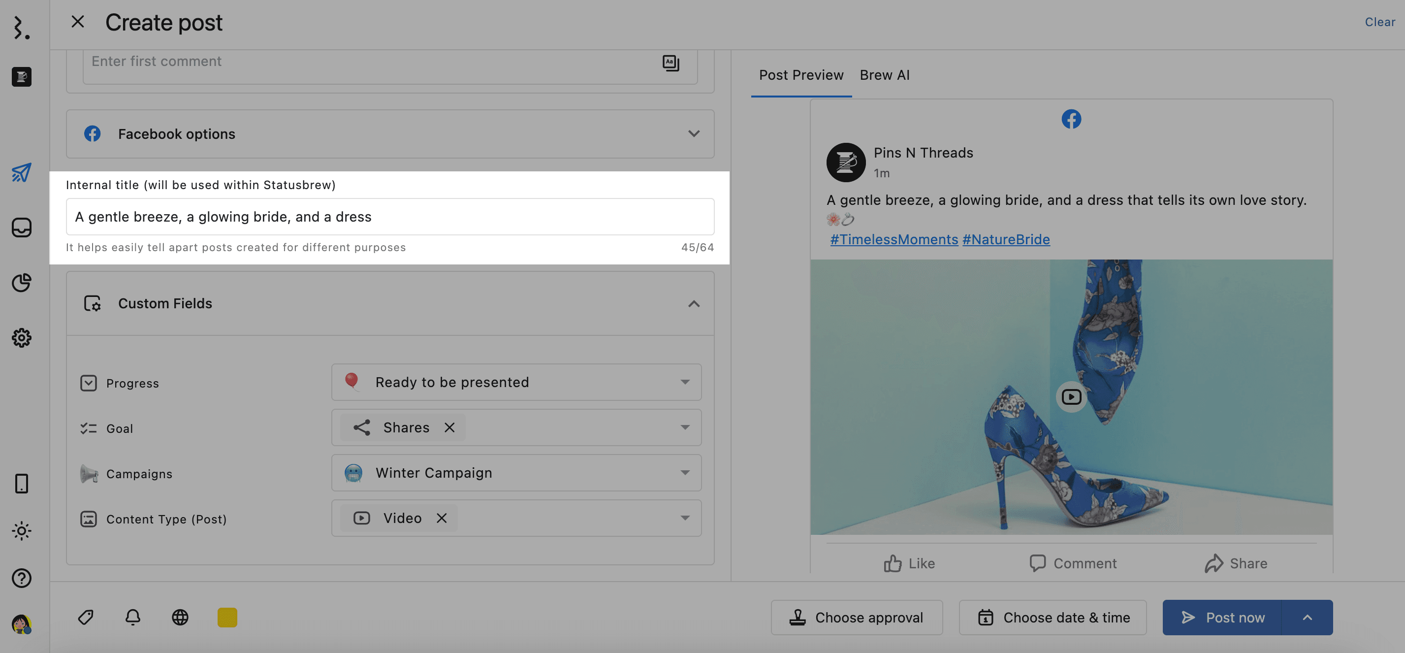 Add a post title for internal use within Statusbrew to easily differentiate posts created for different campaigns or purposes. This title is not published to your social networks; it’s only visible to your team for better organization and tracking.