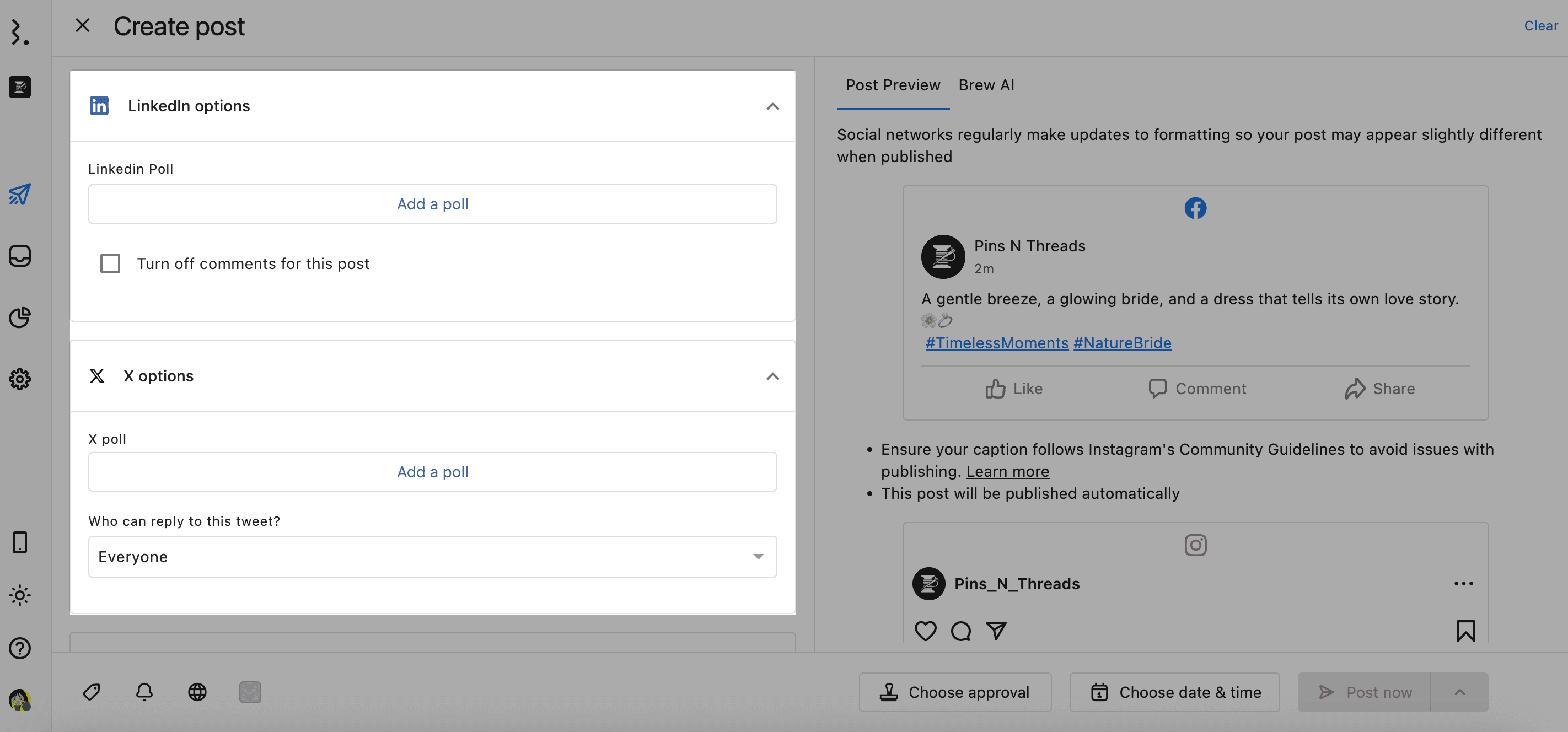 You will also see network-specific options, which allow you to customize posts according to each social network’s unique features. For example, you can create a Facebook Dark Post, add a LinkedIn Poll, or add a poll in X posts.