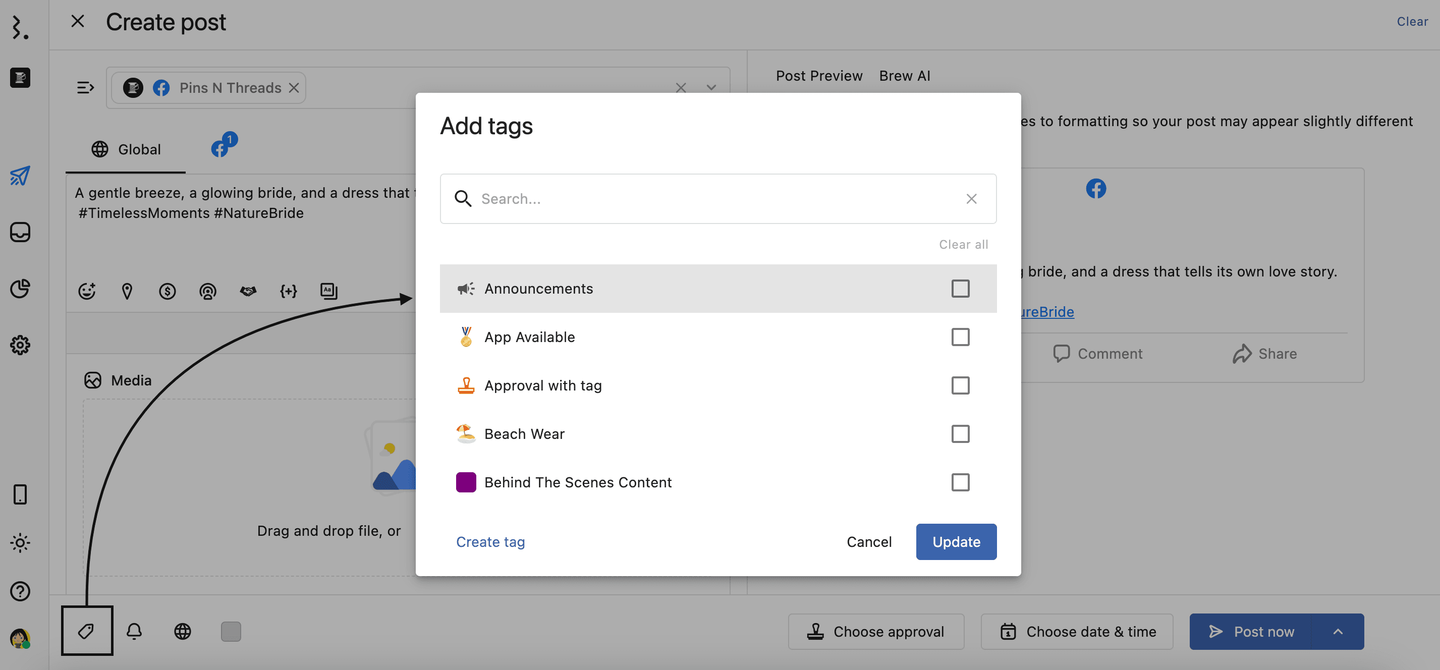 Assign tags to your post to categorize it by campaign, topic, content type, or any other custom label you have created in Statusbrew.