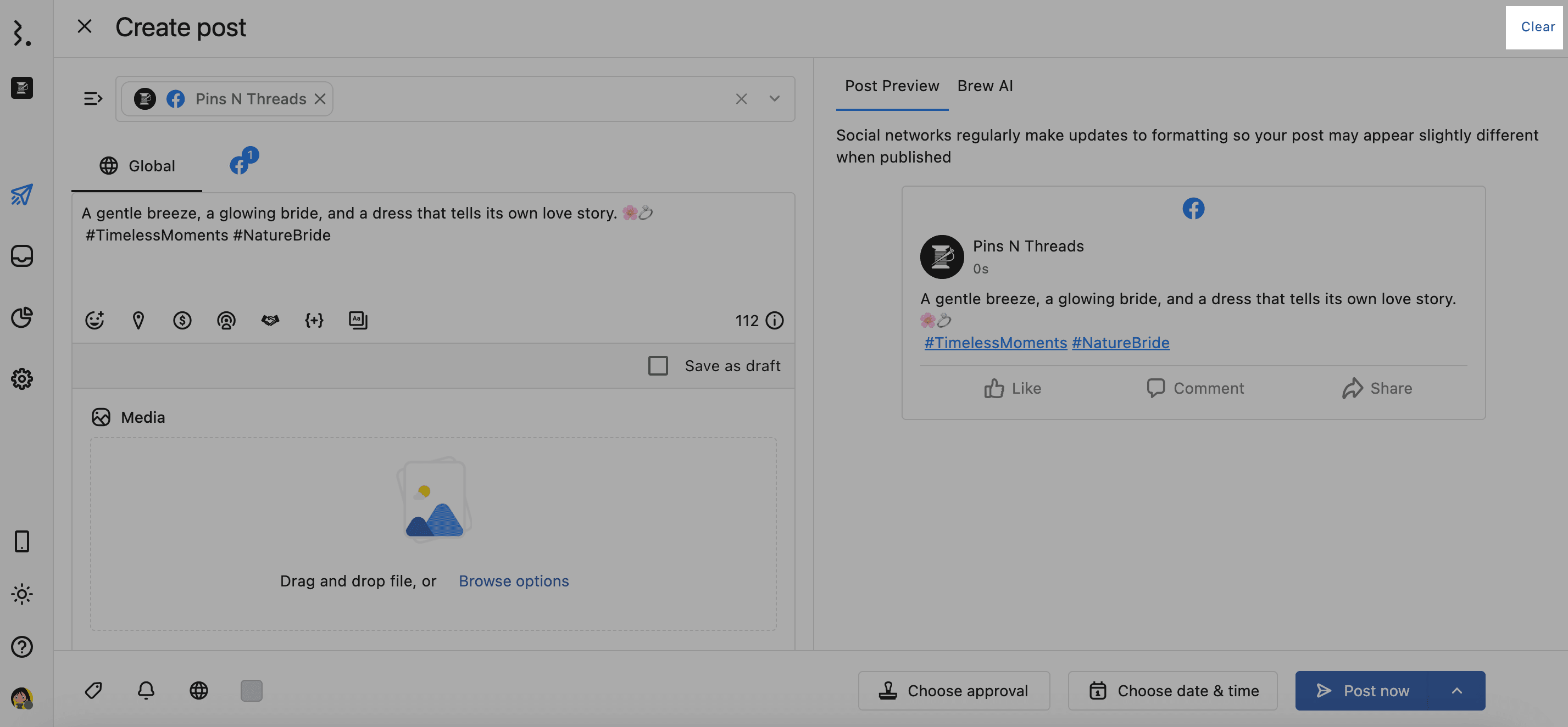 In the top-right corner of the Create post window, you’ll find the Clear button. Clicking this button instantly empties the window, removing all entered text, uploaded media, and any additional options you’ve set for the post.